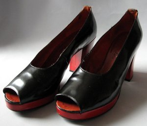 Secondly, the black patent peeptoes with red platform soles and heels. Which I wore with my black and red striped Biba dress to the Scissor Sisters gig last summer.