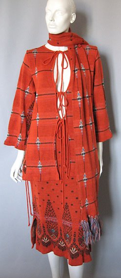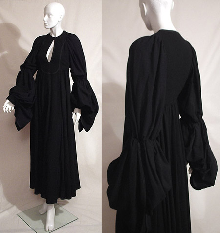 Last night I was lucky enough to attend the opening of the Bill Gibb exhibition at the Fashion and Textile Museum in Bermondsey. Well I say lucky, there were far too many people and it was far too hot but aside from that, I had a marvellous time ogling the frocks and trying to avoid all the elbows and arms which kept flying at me (one of which was Twiggy’s, but I’ll forgive her anything!). My own Bill Gibb frock [see below] is far too heavy and hot to be worn even in a cold snap, so I chose to wear my red Biba with the very Gibb-esque sleeves. Turns out that red Bibas teamed with red lipstick (I was channelling Wendy B!) are a good ice-breaker and I met some very lovely people while I mooched around.