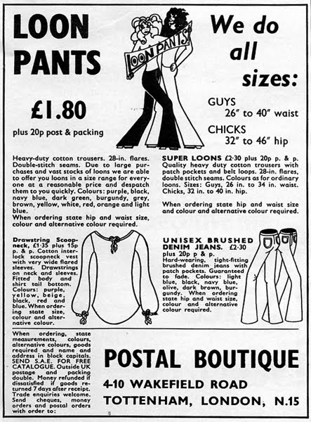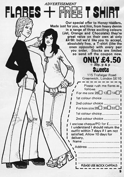 …a time travelling post box yet? At one time, the otherwise-evil-Topshop were doing some brilliant loons which I’m probably on the verge of wearing out because of the poor quality of modern denim. I knew I should have bought four of each style. Now there’s hardly anything approaching a decent flare and we seem to be back to bloody low-rise ubiquity again. Sigh. I want to order from these 1972 adverts. I want the flares AND the tops. Why was I born too late? Why?