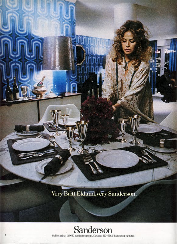 britt ekland, hair, interior design, loungewear, sanderson, seventies fashion