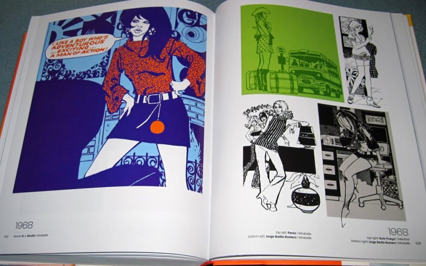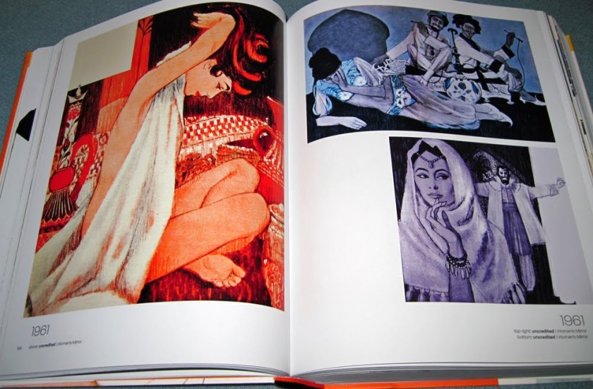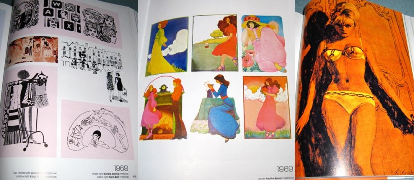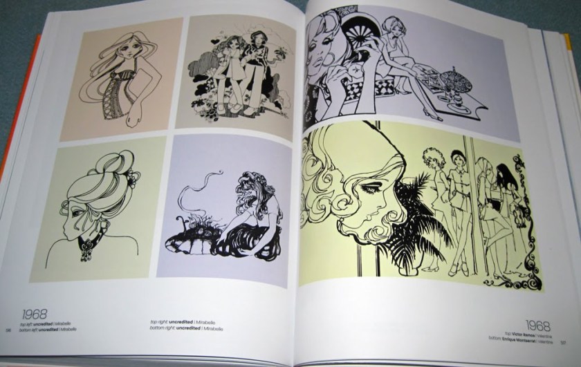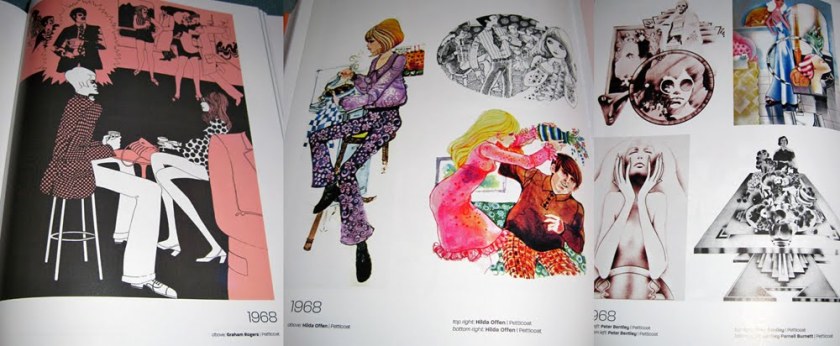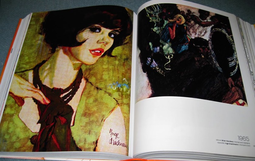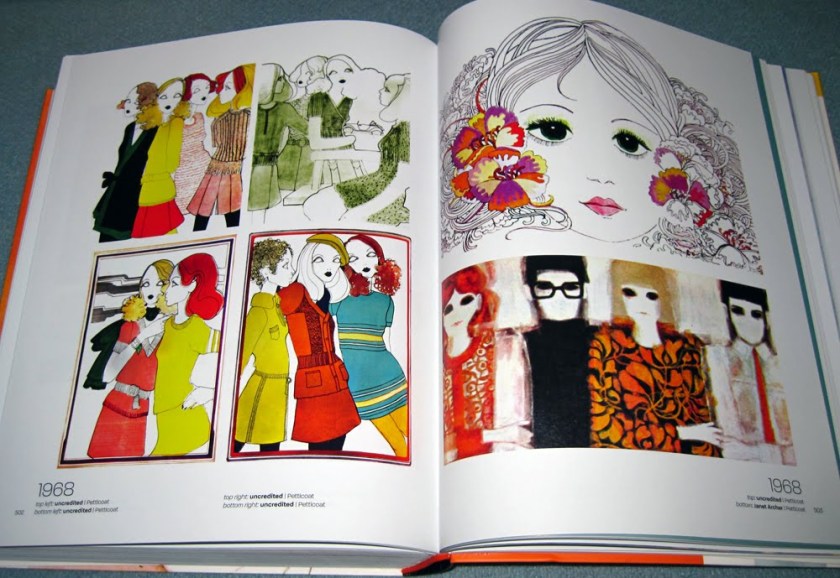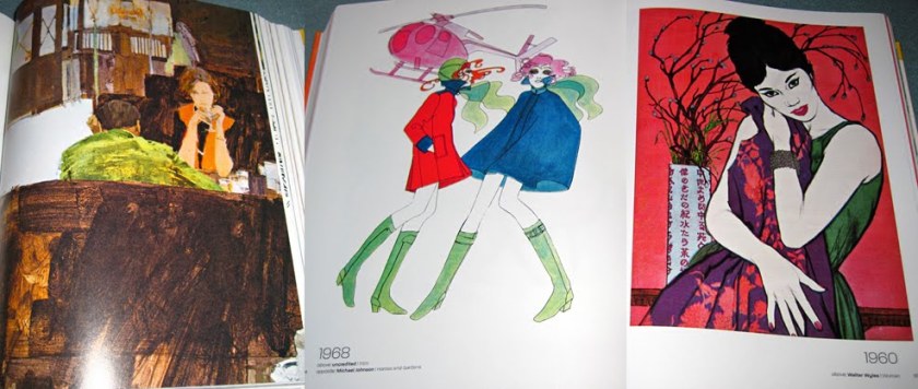 So I decided to sit and flick and take photographs of the most ‘ooh’-inspiring pages. Of course I had to give up after about 20 photos because I realised I would end up photographing the entire thing. But here are the collated images, just casually snapped so you get some feeling of what it’s like. Unsurprisingly, I’m most taken with the later period with the psychedelic, art deco and art nouveau influences, but I’ve tried to show you a cross-section of the entire book.
