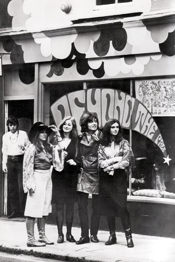 London, England, 1968, Former psychology student opens London’s latest Boutique, ‘Beyond the Pale’, Seen here are (L-R) Manageress Jo Cruickshank, model Chantey Mulville, owner Peter Woodworth & model Anthe Holt