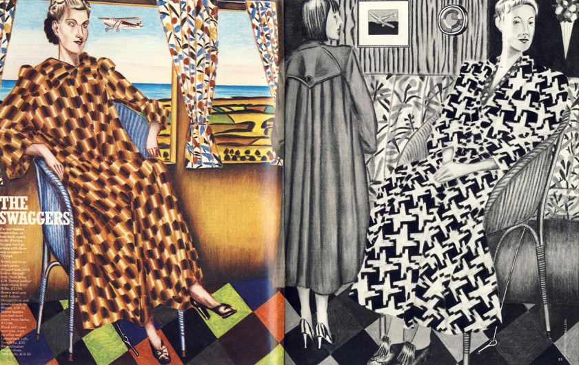 From 19 Magazine, September 1974. Left and right coats are by Biba. Illustration by Paul Leith.