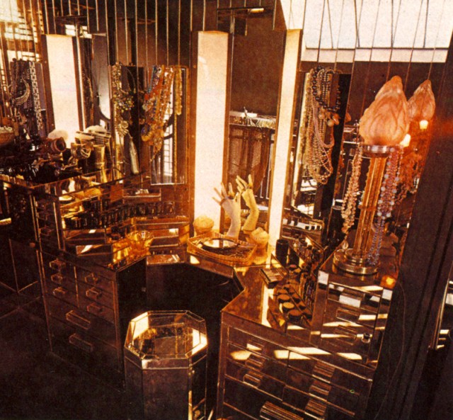 The bed, above, hung with shawls, scattered with sequinned brocaded cushions. Barbara Hulanicki reflected in the bedside mirror on the writing desk and in the centre of the mirrored bed-head. On the right, a peach mirror flex set of shelves, with photographs, figures, eight Art Deco plastic handbags.