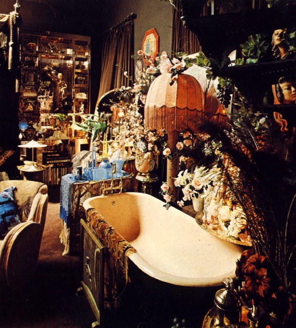 The bath, a riot of peach and plastic flowers. Ornate brass taps, Art Deco screen. Brilliant blue glass, candlesticks and pearly plastic grapes.