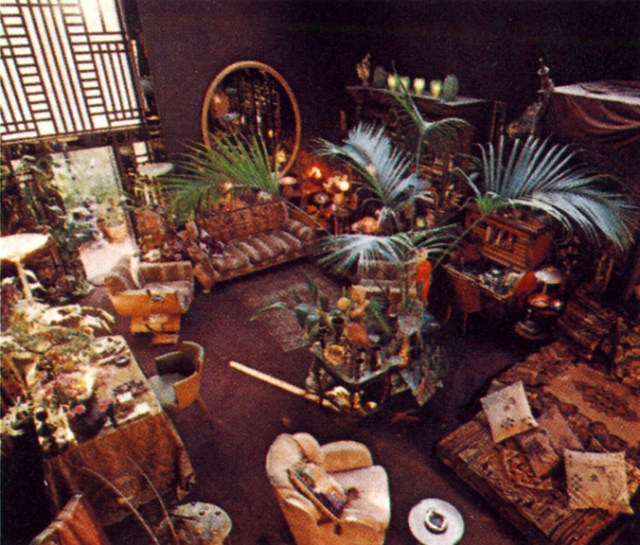 A section of the studio. Beneath the gallery one discovers a sink, kettle. cooker below a thirties’ Grecian frieze. Art Deco chairs in peach moquette. Screen, with beaded shawl. purple plastic  grapes behind a delicate nasturtium-leaf lamp hung with beaded fringe