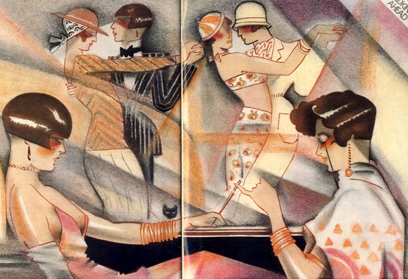 LEFT TO RIGHT: Martine in a chemise dress inspired by Roland Chakkal at Mendes. Make one yourself from a ‘Twenties‘ slip. She amuses herself by.toying with her cigarette holder (held just for show), while listening to the jangling of her nine A bangles. Her drop-earrings glitter, her tight bead choker sparkles and one arm is snug in its elbow-length glove.