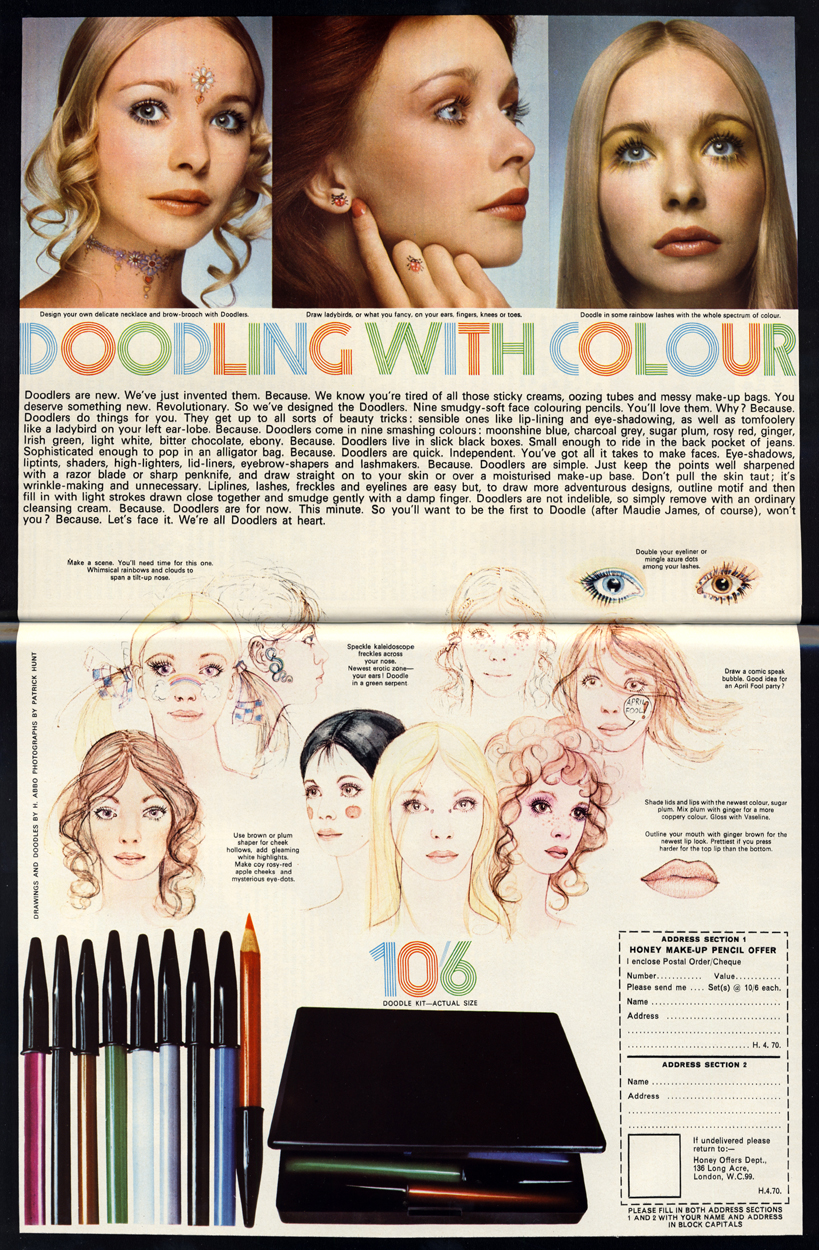 Hmmm. What shall I try first? A rainbow across my tilt-up nose, or should I wait a few weeks and do the ‘April Fool!’ one? Some good make-up tips here, I particularly love the rainbow lashes, and I would now dearly love to get myself a Doodle Kit.