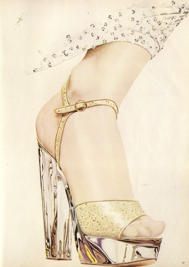 It’s a great shame that the perspex platform has become so indelibly linked with pole dancing and general modern “Made in China” market stall tat, because they had such a gorgeous pedigree from the Forties, and later in the Seventies. These are by the great Richard Smith for Chelsea Cobbler, beautifully hand-painted for Vogue by Michael English.