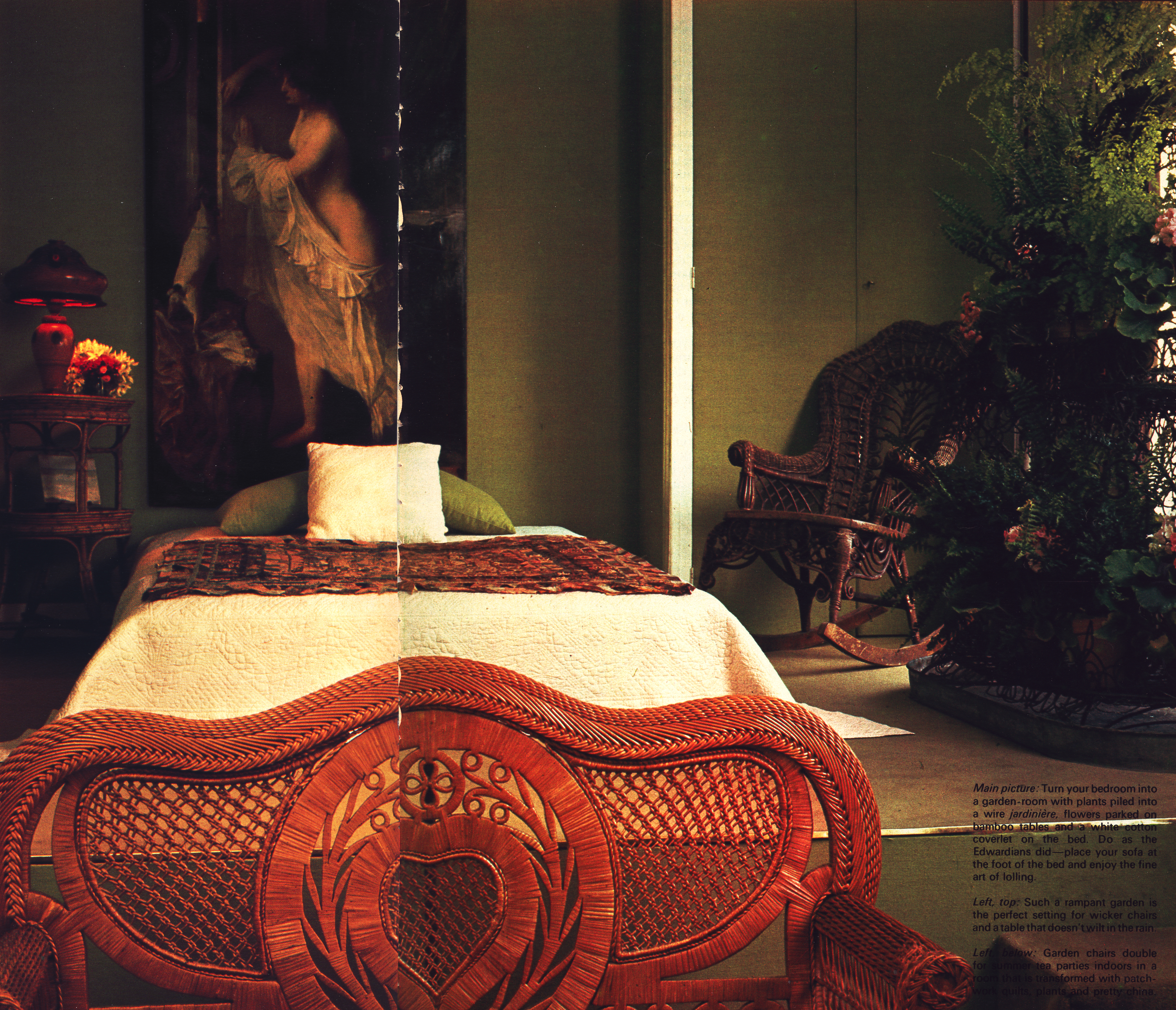 The merest breath of a heat-wave brings out the Southern Belle in our souls. Hot afternoons and long, sunlit evenings make you long to loll about on wicker chaises, sipping lemon tea. The dry, woody smell, the evocative creak of wicker and cane furniture is the essence of summer and, unlike some summer passions, cane and wicker survive and work in winter, too. Annick Clavier, a young French designer, chooses her wicker well—painting some junk-shop finds in white enamel, oiling other pieces of wicker and bamboo to a fine Oriental shine. Her taste runs to airy, lacy furniture and rush matting, set off by many green plants, small jugs of flowers and reproductions of romantic paintings. The fact that she has a garden helps the tropical feeling. Wicker freaks look for decorative pieces in junk shops and markets. They learn to mend broken furniture but avoid bamboo or cane pieces that are very rickety, and watch for the pinholes—a sign that the dreaded woodworm is in residence. Secondhand shops in coastal towns and the remote parts of Scotland and Wales are good places to find Victorian and Edwardian garden and nursery furniture. London has the best selection of shops with modern cane and rattan furniture, mostly imported: Conran, 77 Fulham Road, SW3 imports from China; Cane, 170 Walton Street, SW3 imports from India, as does The Warehouse, 39 Neal Street, London, WC2.