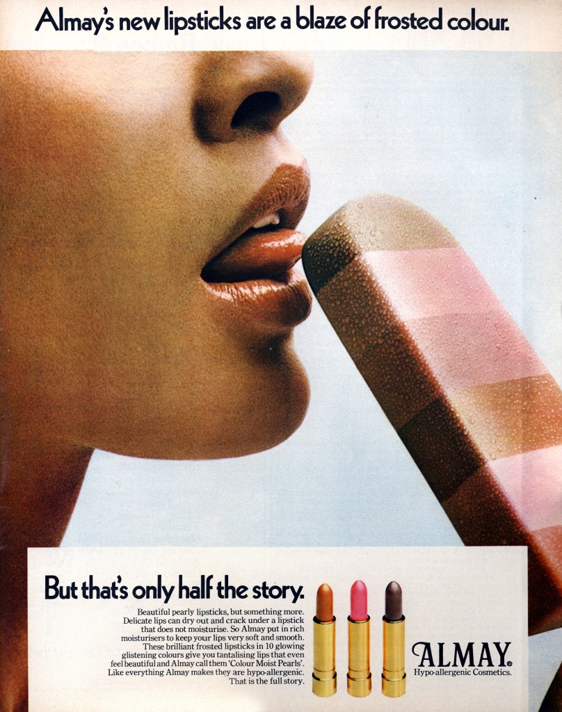 A blaze of frosted colour 19 magazine, 1970s, Almay, Hair and make-up, Make-up, Uncategorized These brilliant frosted lipsticks in 10 glowing glistening colours give you tantalising lips that even feel beautiful and Almay call them ‘Colour Moist Pearls’. Scanned from 19 Magazine, September 1971. Share and share alike: Click to share on X (Opens in new window) X Click to share on Facebook (Opens in new window) Facebook Click to email a link to a friend (Opens in new window) Email Click to share on LinkedIn (Opens in new window) LinkedIn Click to share on Tumblr (Opens in new window) Tumblr Click to share on Pinterest (Opens in new window) Pinterest Click to share on Reddit (Opens in new window) Reddit Like Loading... Related