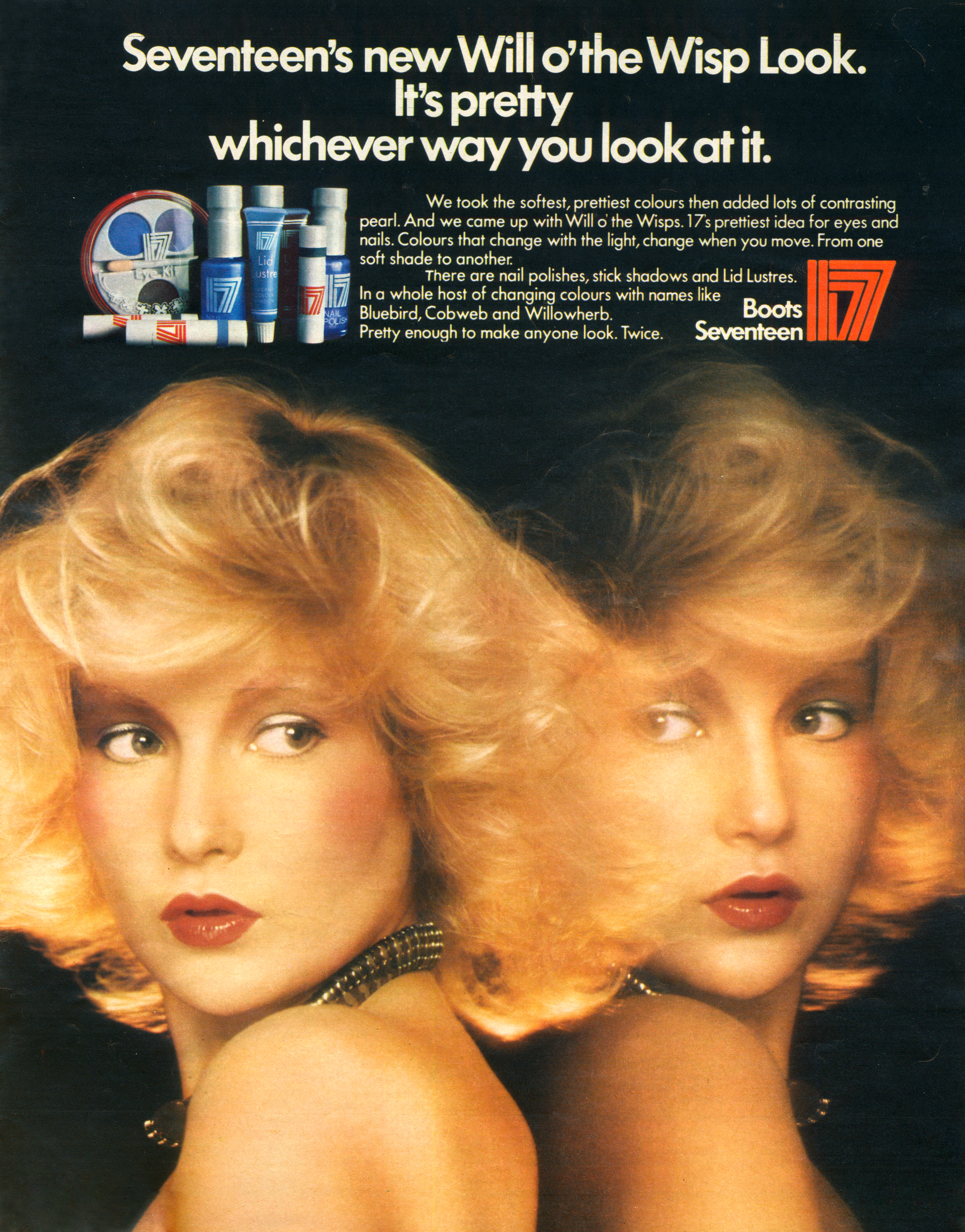 Will O’ The Wisp 1970s, Hair and make-up, Make-up, petticoat magazine, Vintage Adverts Seventeen’s new Will O’ The Wisp look. It’s pretty whichever way you look at it. Scanned from Petticoat, March 23rd 1974. Share and share alike: Click to share on X (Opens in new window) X Click to share on Facebook (Opens in new window) Facebook Click to email a link to a friend (Opens in new window) Email Click to share on LinkedIn (Opens in new window) LinkedIn Click to share on Tumblr (Opens in new window) Tumblr Click to share on Pinterest (Opens in new window) Pinterest Click to share on Reddit (Opens in new window) Reddit Like Loading... Related