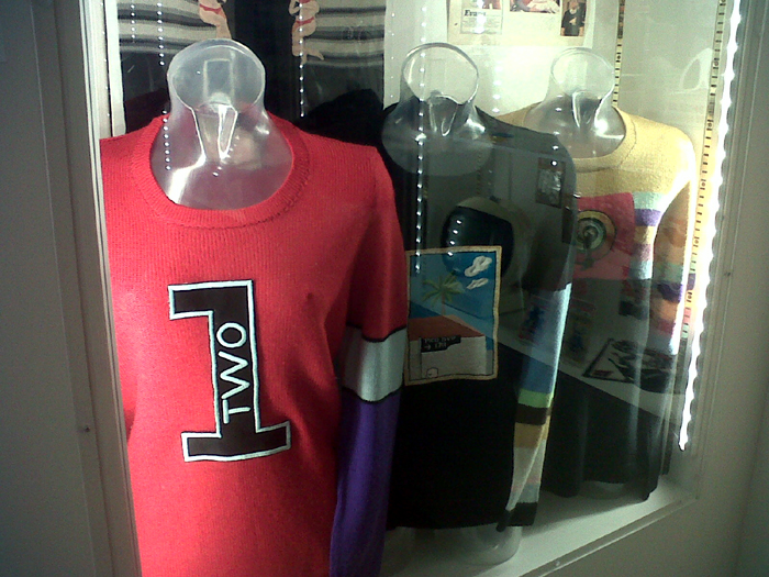 There are some covetable clothes (as well as mine, of course), including the legendary Mr Freedom baseball suit, several Ritva sweaters, a superb Lloyd Johnson jacket and the most adorable novelty print Mr Freedom dungarees loaned by Jan De Villeneuve. Who, I’m afraid, has now been scuppered in her alphabetical superiority because of my earlier omission. Sorry Jan!