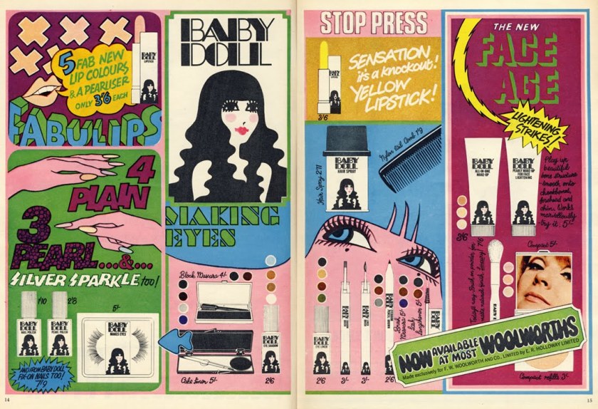 1960s, 1970s, Illustrations, Make-up, psychedelia, Vintage AdvertsMore discoveries on my seemingly endless travels through old magazines… The fact that nobody bothers to create such works of art as these [for the mere purpose of advertising] anymore is everything that is wrong with the modern world. In my opinion. The Woolworths Babydoll make-up advert is a DOUBLE page spread. It’s so exciting to see and, if I could, I would most certainly go and buy up armfuls of it right now. And surely that’s the point of advertising?