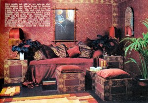 In furnishing, WOMAN Home Editor Edith Blair says: “Barbara came in at a time when young people were wanting to make their homes glamorous, but hadn’t the antiques, old china, Victoriana their parents owned. Biba introduced excitement with inexpensive ideas. Her dyed feathers are marvellous—you don’t have to buy flowers or plants. Her fringing brought a cosiness into decor. Satin and huge cushions look romantic. Her softer look as penetrated many homes.”
