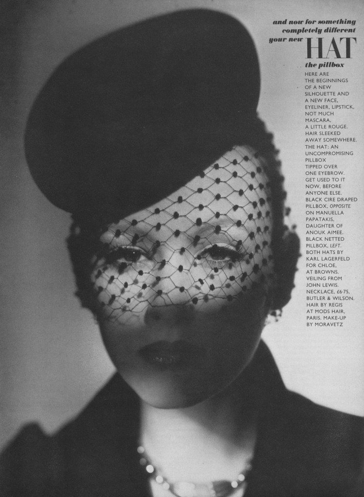Here are the beginnings of a new silhouette and a new face, eyeliner, lipstick, not much mascara, a little rouge. Hair sleeked away somewhere. The hat: an uncompromising pillbox tipped over one eyebrow. Get used to it now, before anyone else.