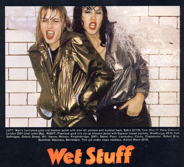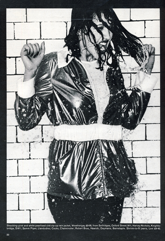 No need, any longer, to be just another bedraggled figure, walking in the rain. Take a long look at the macs we’ve chosen for you – six glamorous shapes to help you look your best. Now you, too, can go singing in the rain!