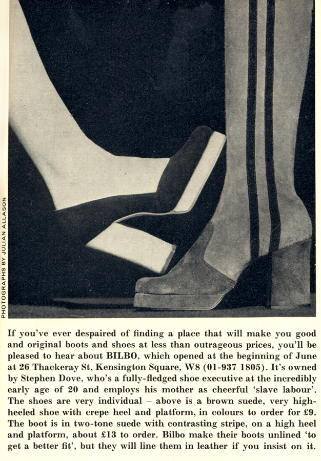 SEXY cut-away cotton knitted halter-neck top, Crochetta, £4, from Knits and Leathers, 5, Harewood Place, W1 and 2, Carnaby Court, Carnaby Street, W1; flaring jet black crêpe high-waisted trousers, Ossie Clark for Quorum, £10, from Quorum, Radnor Walk, SW3; flamboyant flocked canvas shoes, Chelsea Cobbler, £11.95; “Shady Lady” straw hat, Buckle Under, £7; carved rose bangle, Butler and Wilson, £5.50; artificial rose, Biba, £1.15.