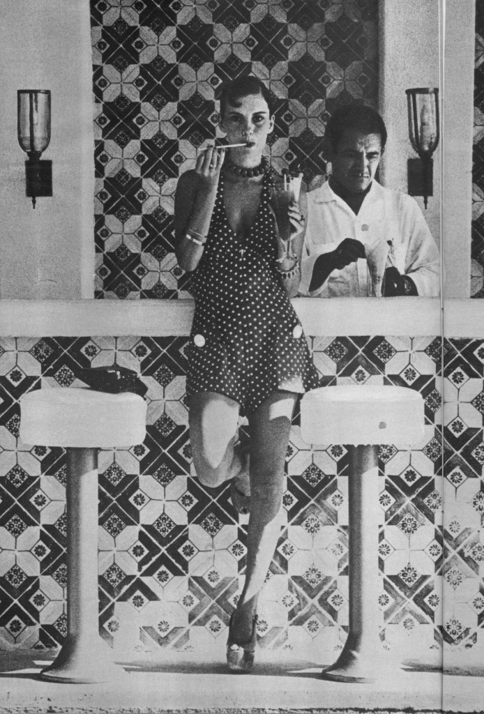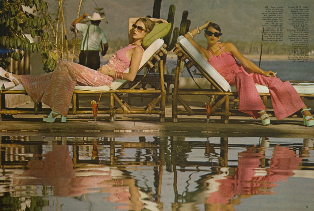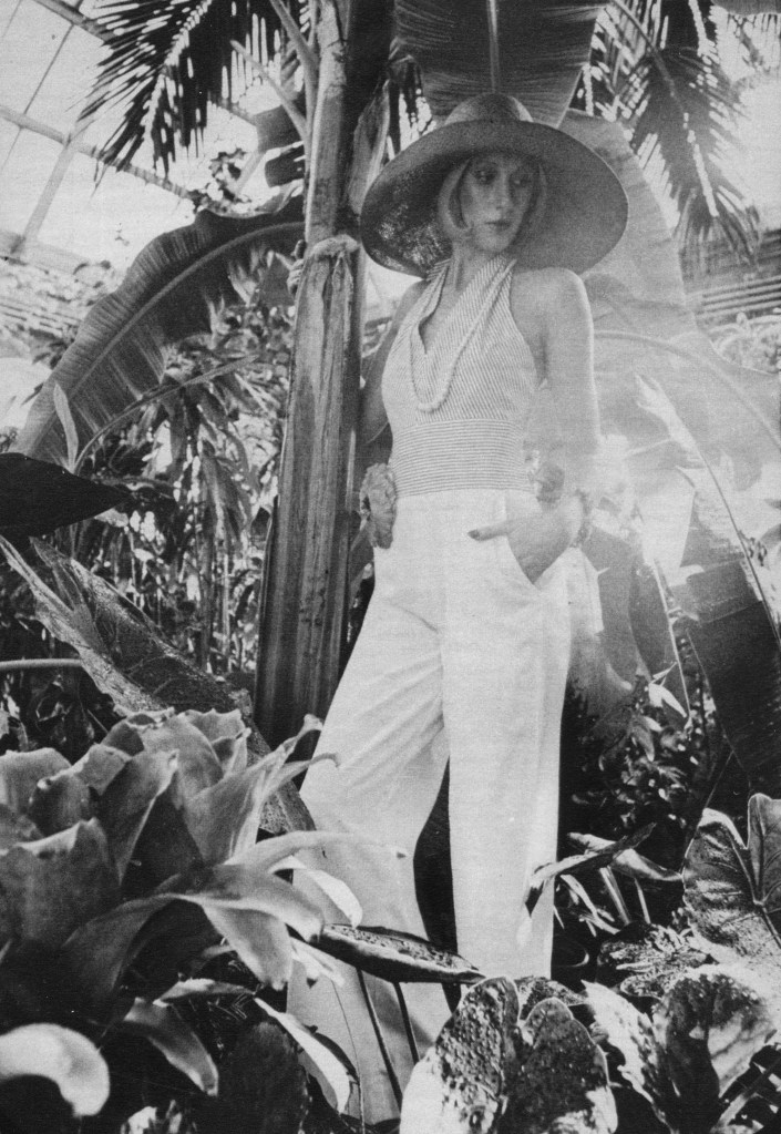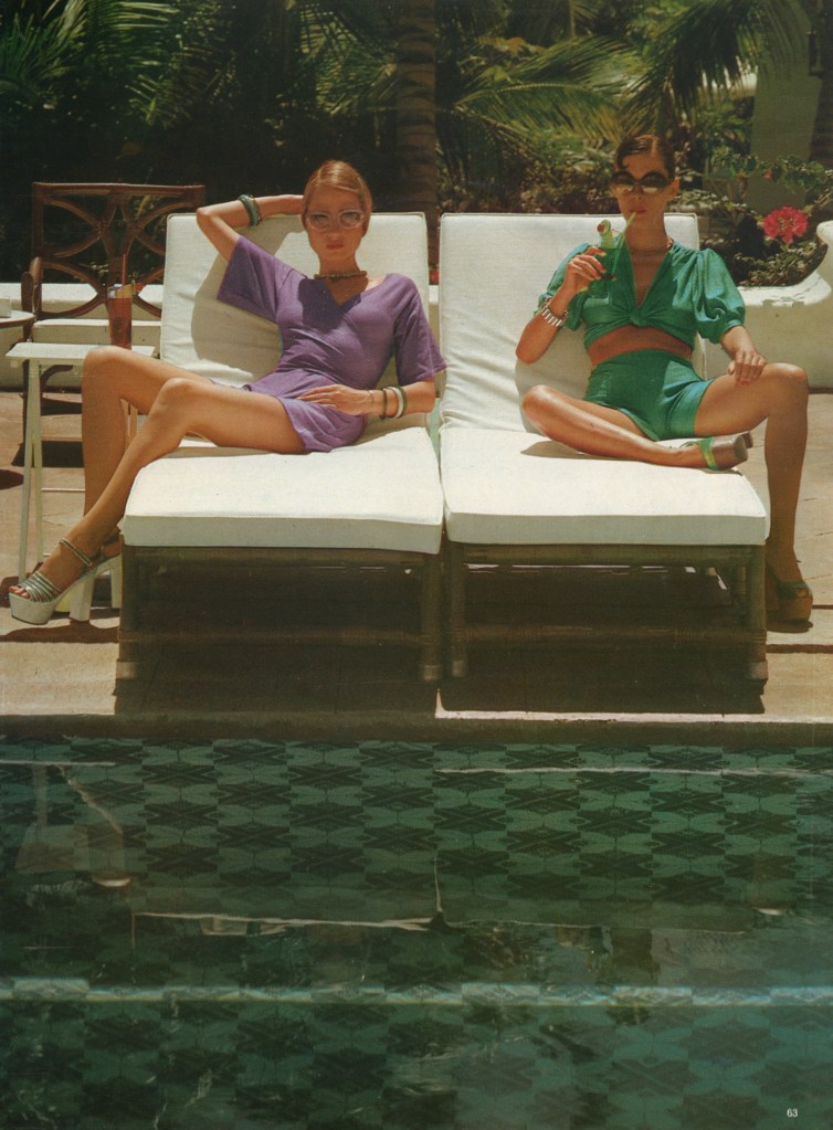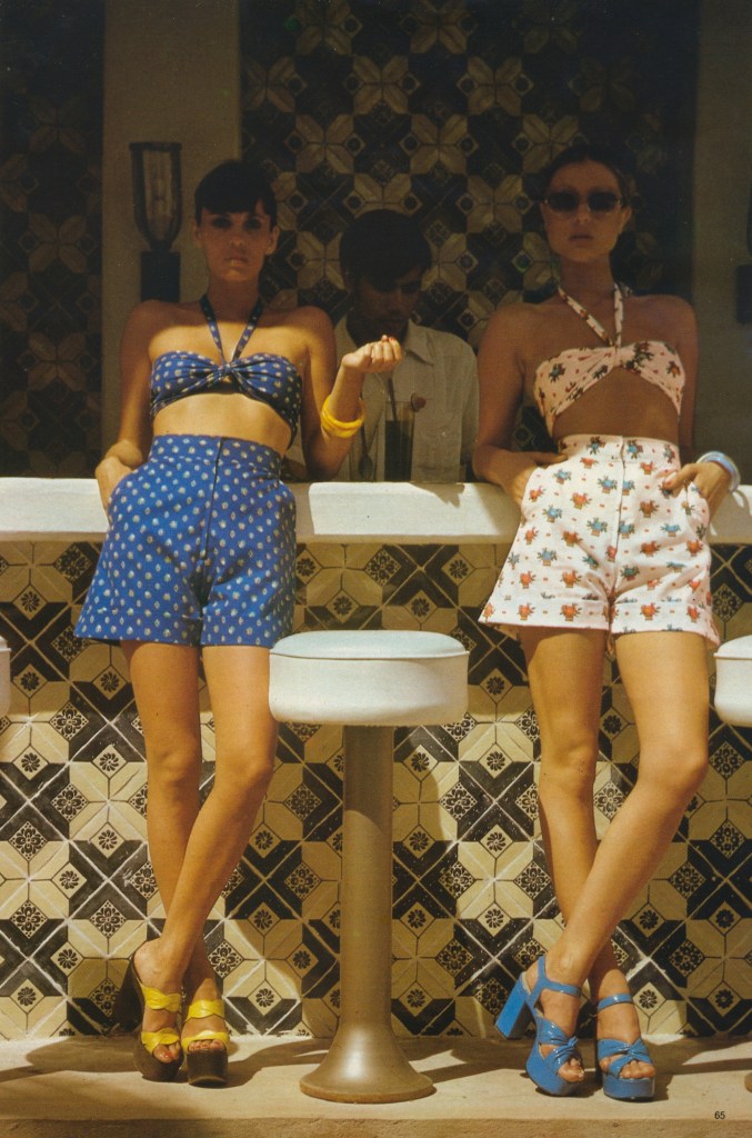 A strenuous day’s sightseeing deserves some-thing more than a cold Campari. In such an idyllic scene you’ll want to look exotic as a jungle flower, cool as that shimmering, irresistible pool. Playsuits—trousers or shorts, halter-necks or wrapovers—blossom bright, beautiful and shamelessly sexy.