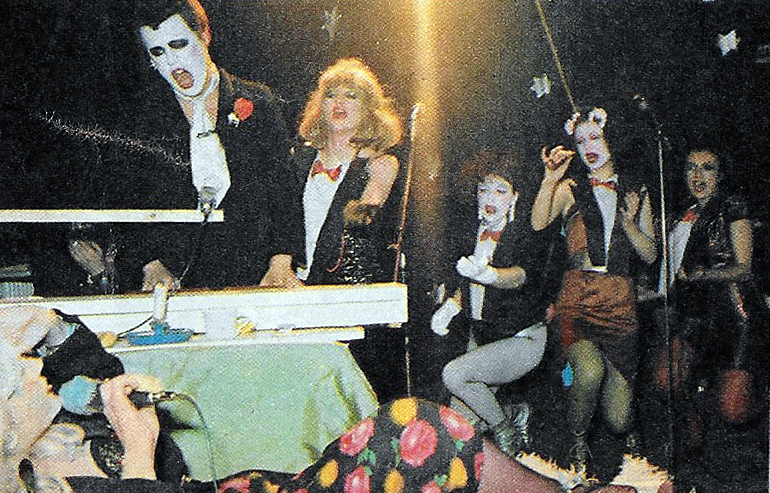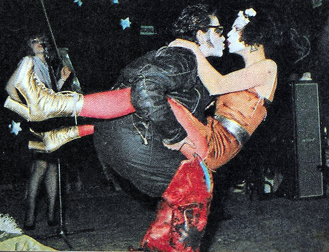 The numbers that The Moodies perform are firmly anchored in the Fifties and Sixties and ignore the current pop obsessions for necrophilia, drugs, suicide and the like. But under their bizarre make-up they are entertainers of the Seventies, rather than a group of decadent kids living off the nostalgia for ‘golden oldies’. On a good night, when the audience is firmly on their side, they create an atmosphere more like that of a private party than a sterile public performance; they earn their laughs through the juxtaposition of songs, their eccentric make-up, their idiotic props and their energetic dancing.