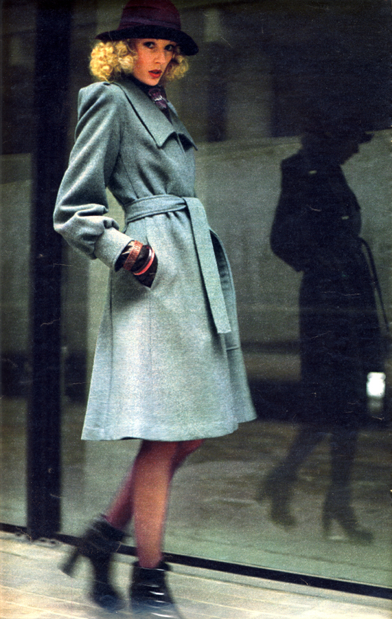 Blue button-front long dress, £8 Ss. from main Wallis Shops. Beige long-sleeved shirt, £3 13s. 6d., turquoise coat, £13 13s., long black skirt, £5 Ss. all from Bus Stop, W.8. Worry beads, £15s. from The Greek Shop.