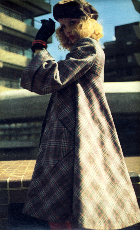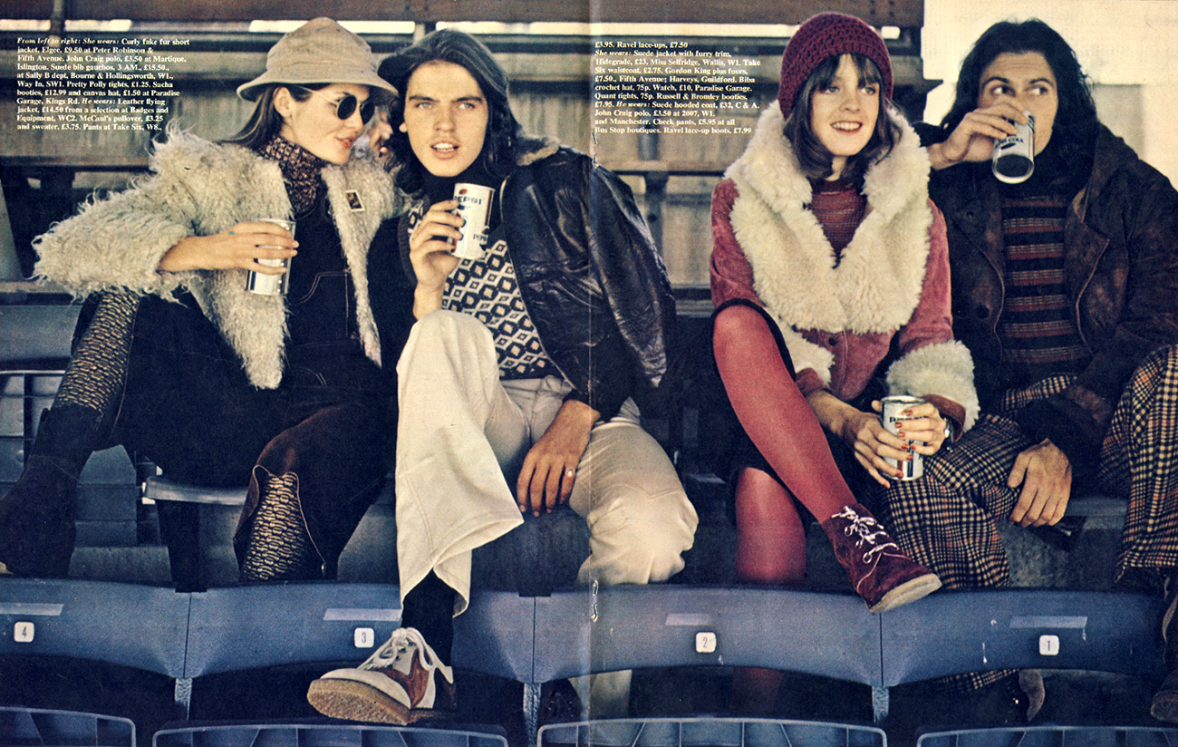Maroon herring-bone coat, £18 10s., with matching trousers, £5 by Elgee from Miss Selfridge. Ravel red patent brogues, £6 6s, Lilac velveteen shirt by John Craig, £3 12s. from Stop the Shop, S.W.3. Brown and white tweed coat, £16 10s. C & A. Paisley scarf by Richard Allan, £3 3s. Grey herringbone coat, £13 2s. 6d., matching trousers, £414s. 6d., from Bus Stop, W.B. and the new shop in Birmingham. Boots by Sacha, £7 7s. Fringed scarf by Sujon, £3 13s. 6d.