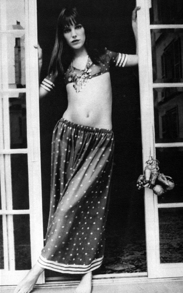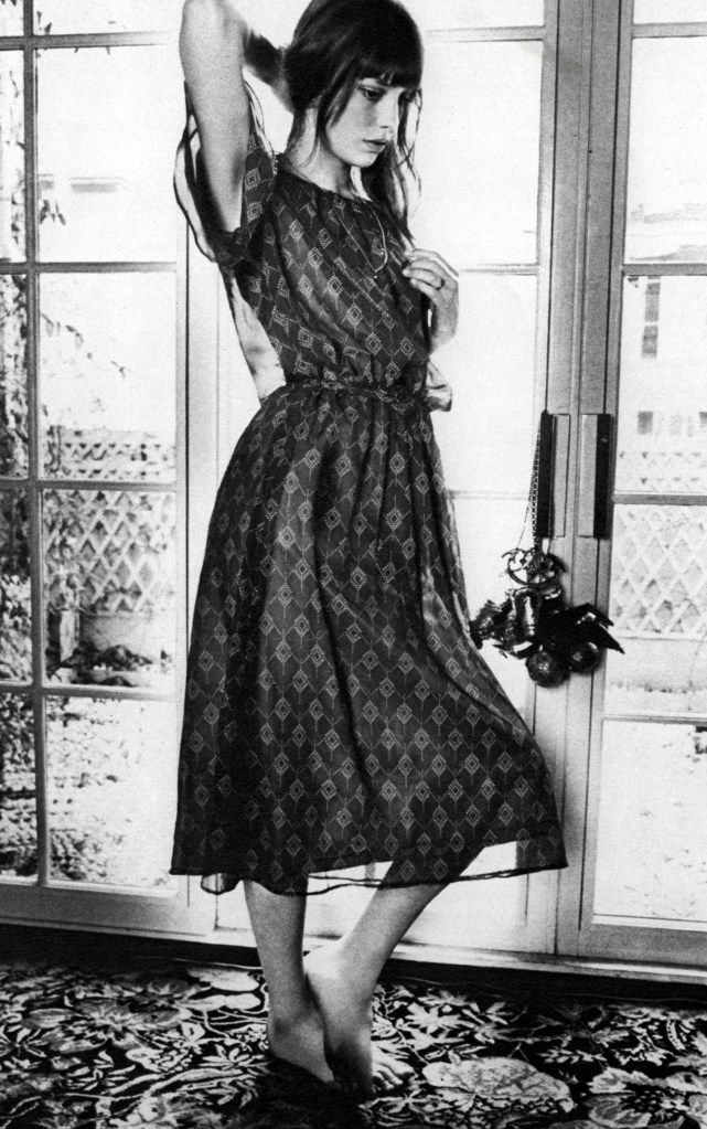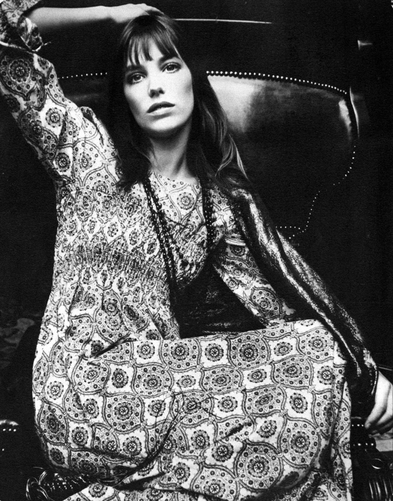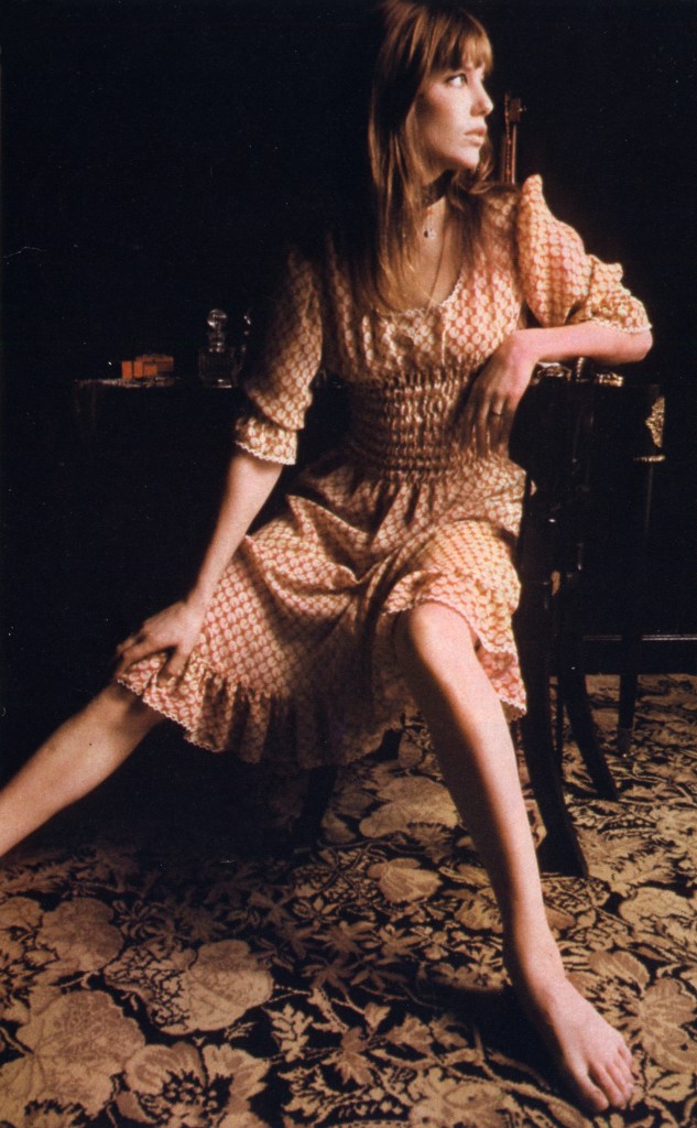 It looks as if England has lost Jane Birkin forever … she is firmly entrenched in Paris with baby Kate, nanny and the lovely Serge Gainsbourg, living in sombre luxury in their newly acquired house. The interior is stark and dramatic, every room is decorated in black and white, with white doors and black marble floors or carpet. The furniture is also black and white—there’s a big black shiny piano in the lounge, and a black mink cover adorns the bed which is raised off the floor on a black perspex dais. Weekends are usually spent at a quiet retreat in the country, making a sharp contrast to the busy social life that they lead during the week. Since Jane landed in France she has never stopped working. Film after film has been completed and the success of the record she made with Serge, which was also written and composed by him, Je T’Aime … Moi Non Plus, has led to an LP also written by Serge. Her life is chaotic and busy, it seems as if the telephone never stops ringing. People phone her every day with offers of interviews and films, the next of which is still a closely guarded secret. It was whilst she was making her first film in France, Slogan, that she met and fell in lovewith Serge, an event which seems to have altered her life but through it all she remains the same—a waif of a girl, tall and lanky, in pullover and jeans, serving tea out of her treasured English teapot. Her wardrobe is noticeably small, consisting mainly of casual clothes like pullovers, T-shirts and jeans; with the occasional gipsy-type dress reserved for the evening and worn with gold chains, loop earrings and gipsy belts. She acquires most of her clothes by chance buying, rarely by intentionally setting out on a spending spree. Usually she just spots something she likes in a shop window and ends up by going in and buying it. In London she shops mainly at Countdown, Foale and Tuffin, and Quorum. She buys her jewellery from the Chelsea Antique Market. In Paris she favours the more trendy designers like Mia and Vicky or Jean Bourquin. Jane is perfectly happy spending hours hunting about in antique shops for interesting little knick-knacks, like the 18th-century doll’s house which she gave to her Serge for Christmas.