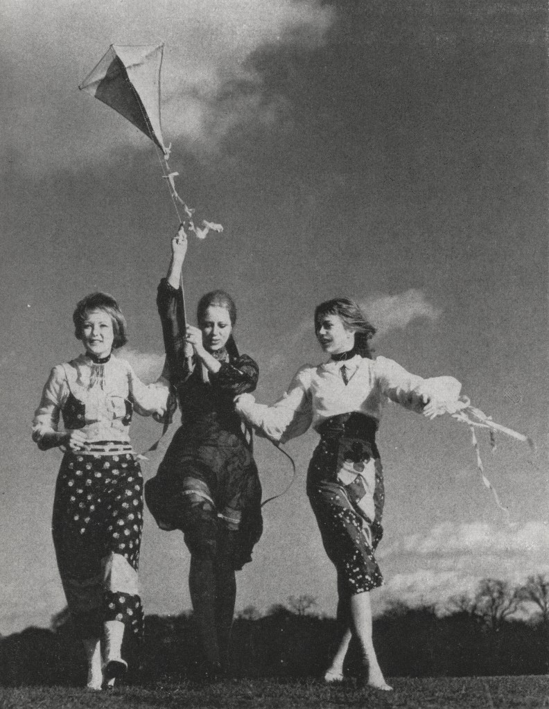 Three Boyds on the wing, above. Three sisters from Devon. Paula, 19, in skirt and jerkin of red and grass green mixed up cotton prints. £15, by Foale & Tuffin, at Feathers. White voile shirt, by Leslie Poole, £5, at Countdown. Thea Porter bead and velvet choker. Patti, 25, Mrs George Harrison, in peasant dress, green butterfly chiffon, £50. Afghan choker, £16. Both at Thea Porter, 8 Greek St, W.1. Jenny, 22, in red and green calico flower appliqué skirt. 110, at The Sweetshop, 28 Blantyre St, S.W.10. Thea Porter white shirt.