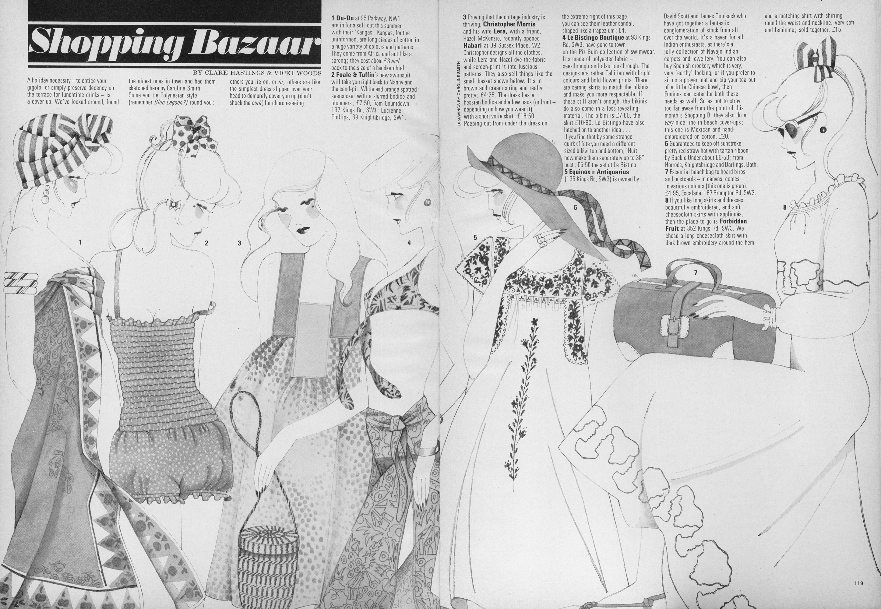 1 Du-Du at 95 Parkway, NW1 are in for a sell-out this summer with their ‘Kangas’. Kangas, for the uninformed, are long pieces of cotton in a huge variety of colours and patterns. They come from Africa and act like a sarong ; they cost about £3 and pack to the site of a handkerchief. 2 Foale & Tuffin‘s new swimsuit will take you right back to Nanny and the sand-pit. White and orange spotted seersucker with a shirred bodice and bloomers ; £7.50, from Countdown, 137 Kings Rd, SW3; Lucienne Phillips, 09 Knightsbridge, SW1. Proving that the cottage industry is thriving, Christopher Morris and his wife Lera, with a friend, Hazel McKenzie, recently opened Habari at 39 Sussex Place, W2. Christopher designs all the clothes, while Lera and Hazel dye the fabric and screen-print it into luscious patterns. They also sell things like the small basket shown below. It’s in brown and cream string and really pretty; £4.25. The dress has a hessian bodice and a low back (or front —depending on how you wear it) with a short voile skirt: £18-50. Peeping out from under the dress on the extreme right of this page you can see their leather sandal, shaped like a trapezium ; £4. 4 Le Bistingo Boutique at 93 Kings Rd, SW3, have gone to town on the Piz Buin collection of swimwear. Its made of polyester fabric —see-through and also tan-through. The designs are rather Tahitian with bright colours and bold flower prints. There are sarong skirts to match the bikinis and make you more respectable. If these still aren’t enough, the bikinis do also come in a less revealing material. The bikini is £7.80, the skirt £10.90. Le Bistingo have also latched on to another idea … if you find that by some strange quirk of fate you need a different sized bikini top and bottom, ‘Huit’ ) now make them separately up to 38″ bust ; £5.50 the set at Le Bistino. 5 Equinox in Antiquarius (135 Kings Rd, SW3) is owned by David Scott and James Goldsack who have got together a fantastic conglomeration of stock from all over the world. It’s a haven for all Indian enthusiasts, as there’s a jolly collection of Navajo Indian carpets and jewellery. You can also buy Spanish crockery which is very, very ‘earthy’ looking, or if you prefer to sit on a prayer mat and sip your tea out of a little Chinese bowl, then Equinox can cater for both these needs as well. So as not to stray too far away from the point of this month’s Shopping B, they also do a very nice line in beach cover-ups ; this one is Mexican and hand-embroidered on cotton, £20. 6 Guaranteed to keep off sunstroke : pretty red straw hat with tanan ribbon ; by Buckle Under about f6.50; from Harrods, Knightsbridge and Darlings, Bath. 7 Essential beach bag to hoard biros and postcards — in canvas, comes in various colours (this one is green). £4.95, Escalade, 187 Brompton Rd, SW3. 8 If you like long skirts and dresses beautifully embroidered, and soft cheesecloth skirts with appliqués, then the place to go is Forbidden Fruit at 352 Kings Rd, SW3. We chose a long cheesecloth skirt with dark brown embroidery around the hem and a matching shirt with shirring round the waist and neckline. Very soft and feminine; sold together, £15.