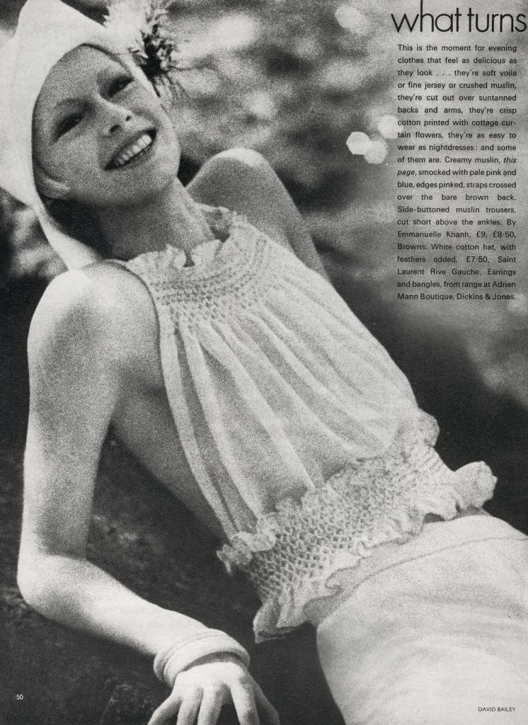 Clothes by Emmanuelle Khanh. Hat by Saint Laurent Rive Gauche.