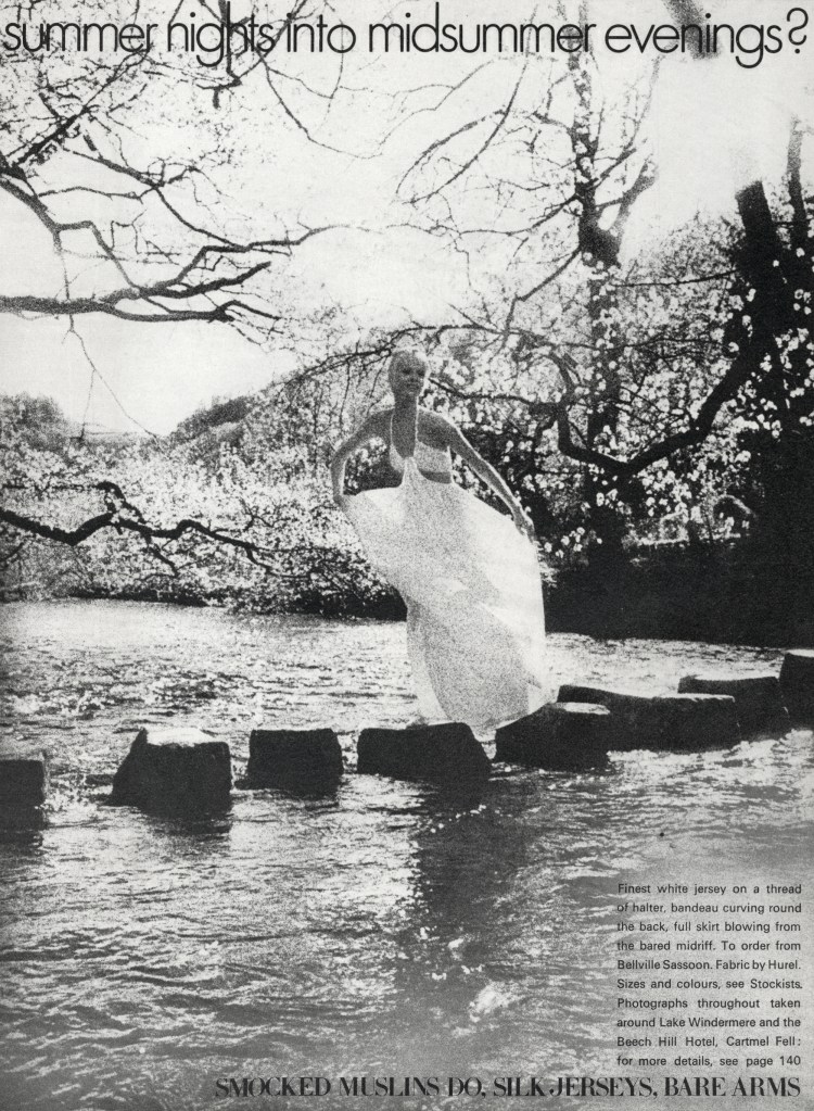 This is the moment for evening clothes that feel as delicious as they look… they’re soft voile or fine jersey or crushed muslin, they’re cut out over suntanned backs and arms, they’re crisp cotton printed with cottage curtain flowers, they’re as easy to wear as nightdresses: and some of them are.
