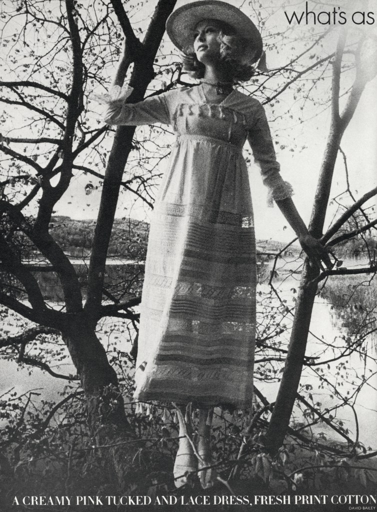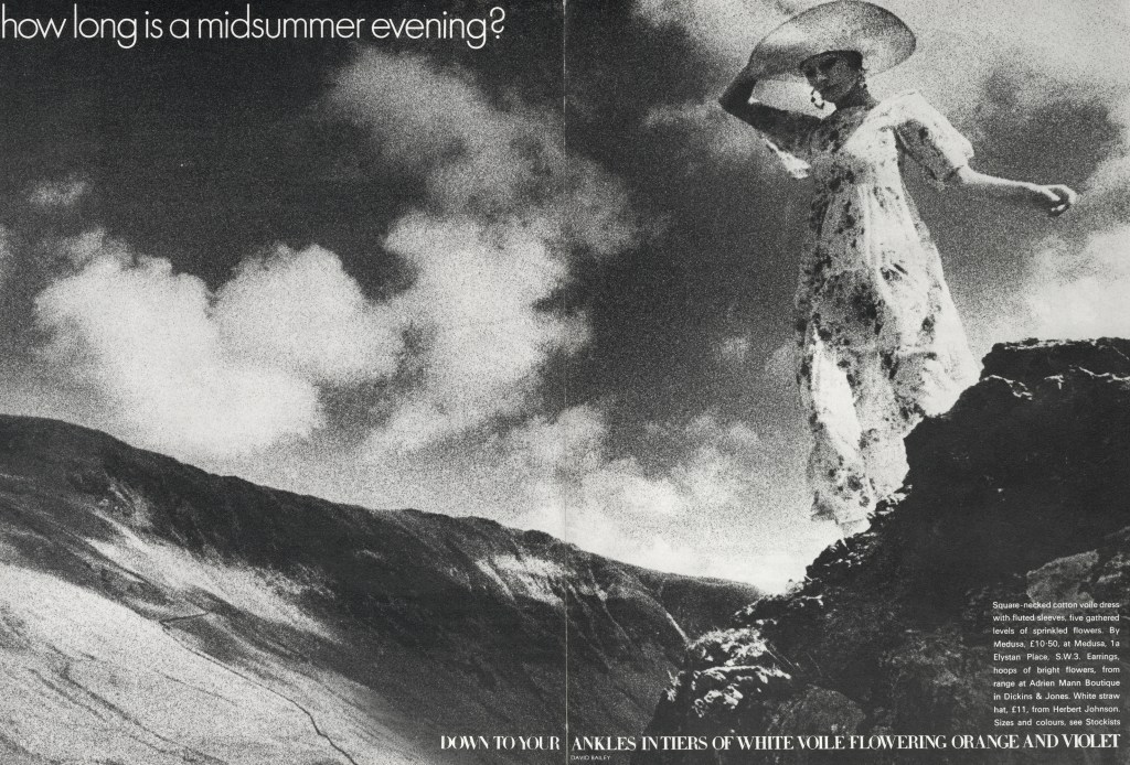 Pale mustard puff sleeved dress by Biba. Brown patent two-strap shoes by Sacha. Scarf by Jasper. / Cream sisal hat by Bermona. Black tea dance dress with delicate white flowery print by Biba. White leather sandals by Ravel. / Navy felt hat from Herbert Johnson. Navy cotton dress by Harriet. Black shoes from The Hollywood Clothes Shop.