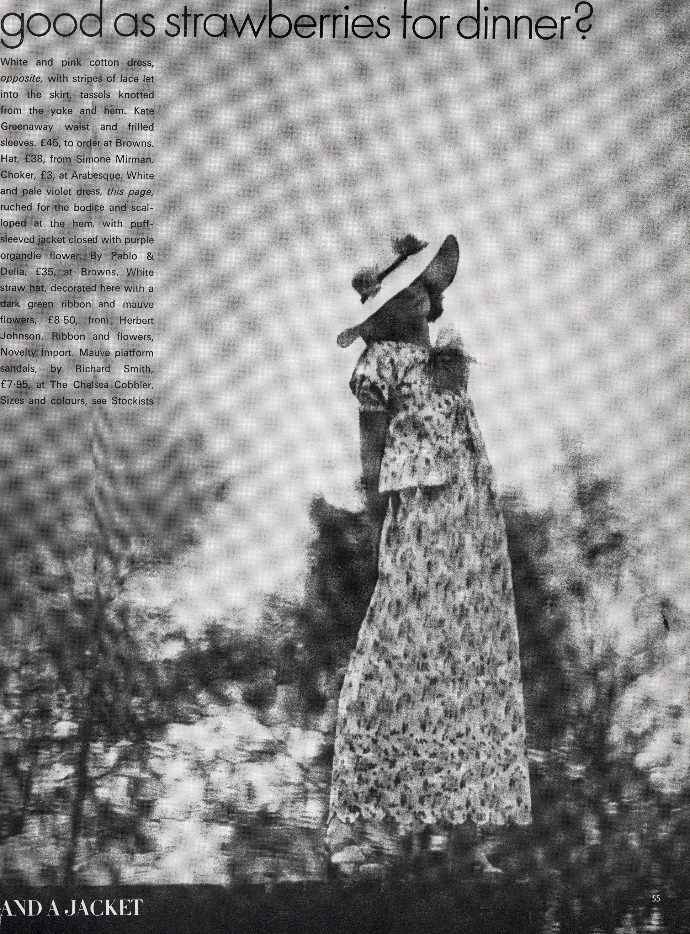 Dress by Pablo and Delia at Browns. Hat by Herbert Johnson. Sandals by Richard Smith at The Chelsea Cobbler.
