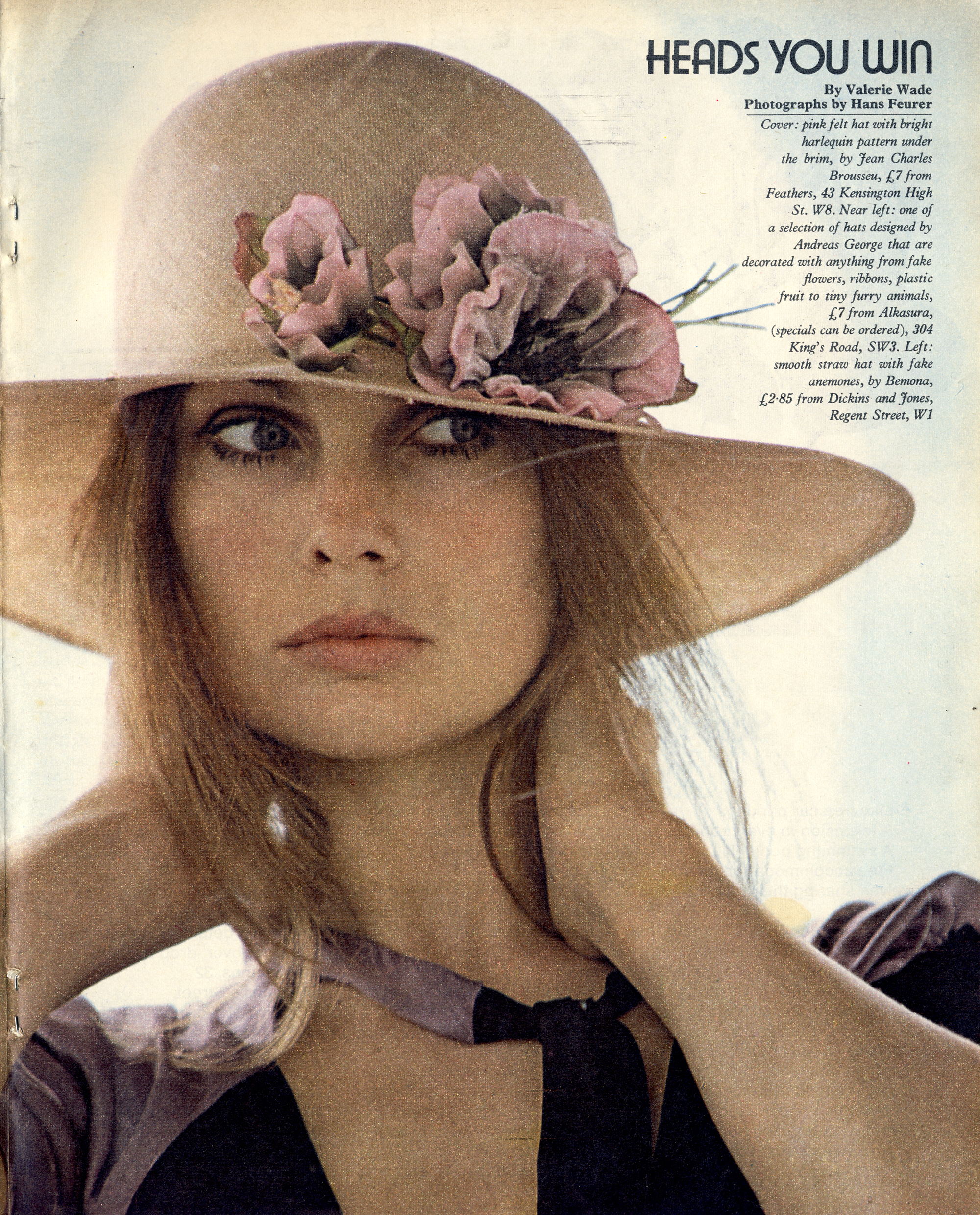 Suddenly this summer the shops are selling masses of hats that before would have only been dug up for garden parties, weddings, sports days or camping it up. For years magazines and designers have shown their clothes with hats, but they don’t usually turn up in the street. Fashion editors often feature ‘picture hats’ like those on the previous page posed in some romantic setting or framing an immaculate new make-up, but one never actually sees them on a number 19 bus. Now hats have gone the way of all clothes; there are no rules; you can wear anything with anything. Any hat, whether it’s wide-brimmed and floppy with half a haberdashery department stuck over it, or a small crocheted cloche pinned with a bunch of plastic fruit, i fine with either nostalgic Forties’ dresses or a dirty old pair of jeans. And you can still wear it to a wedding if you want to.