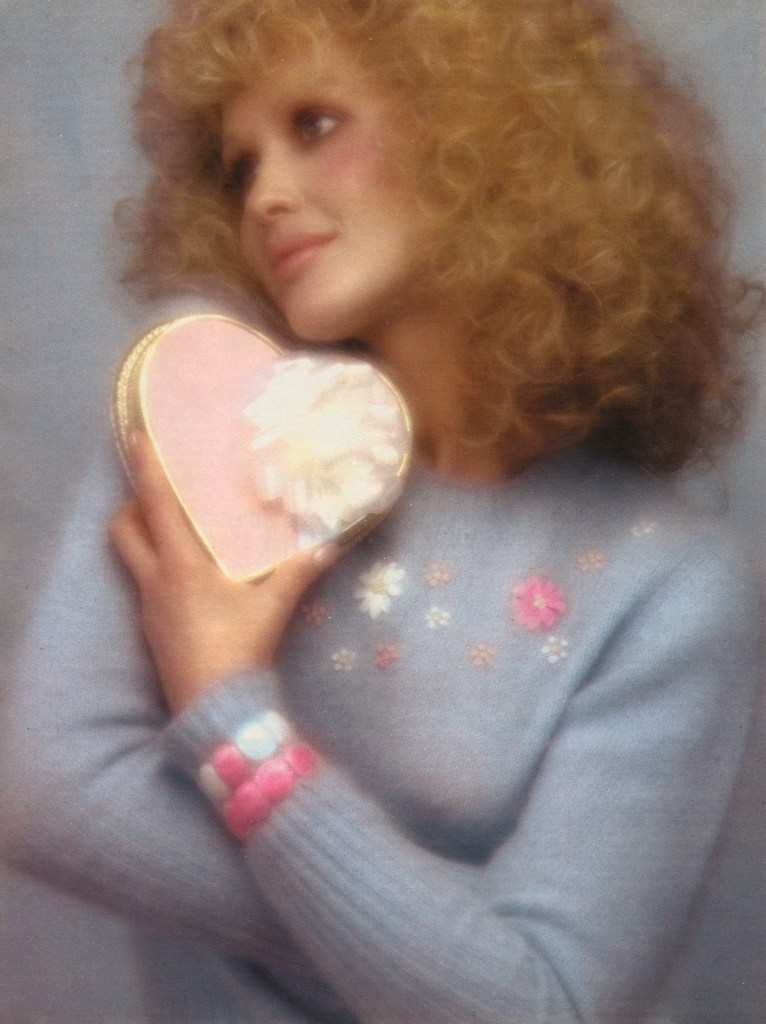 Blue angora and lambswool long-sleeved sweater with pink, white and mauve flowers embroidered on yoke, by Sharcleod, £4. Plastic bracelets from a selection at Biba, 15p. each.