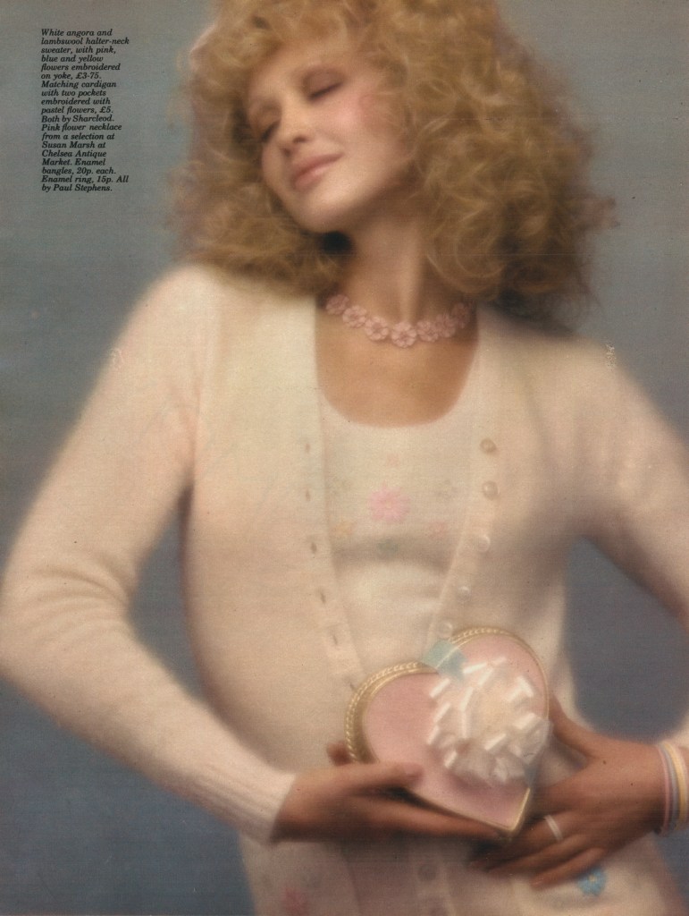 White angora and lambswool halter-neck sweater, with pink, blue and yellow flowers embroidered on yoke, £3.75. Matching cardigan with two pockets embroidered with pastel flowers, £5. Both by Sharcleod. Pink fwer necklace from a selection at Susan Marsh at Chelsea Antique Market. Enamel bangles, 20p. each. Enamel ring, 15p. All by Paul Stephens.