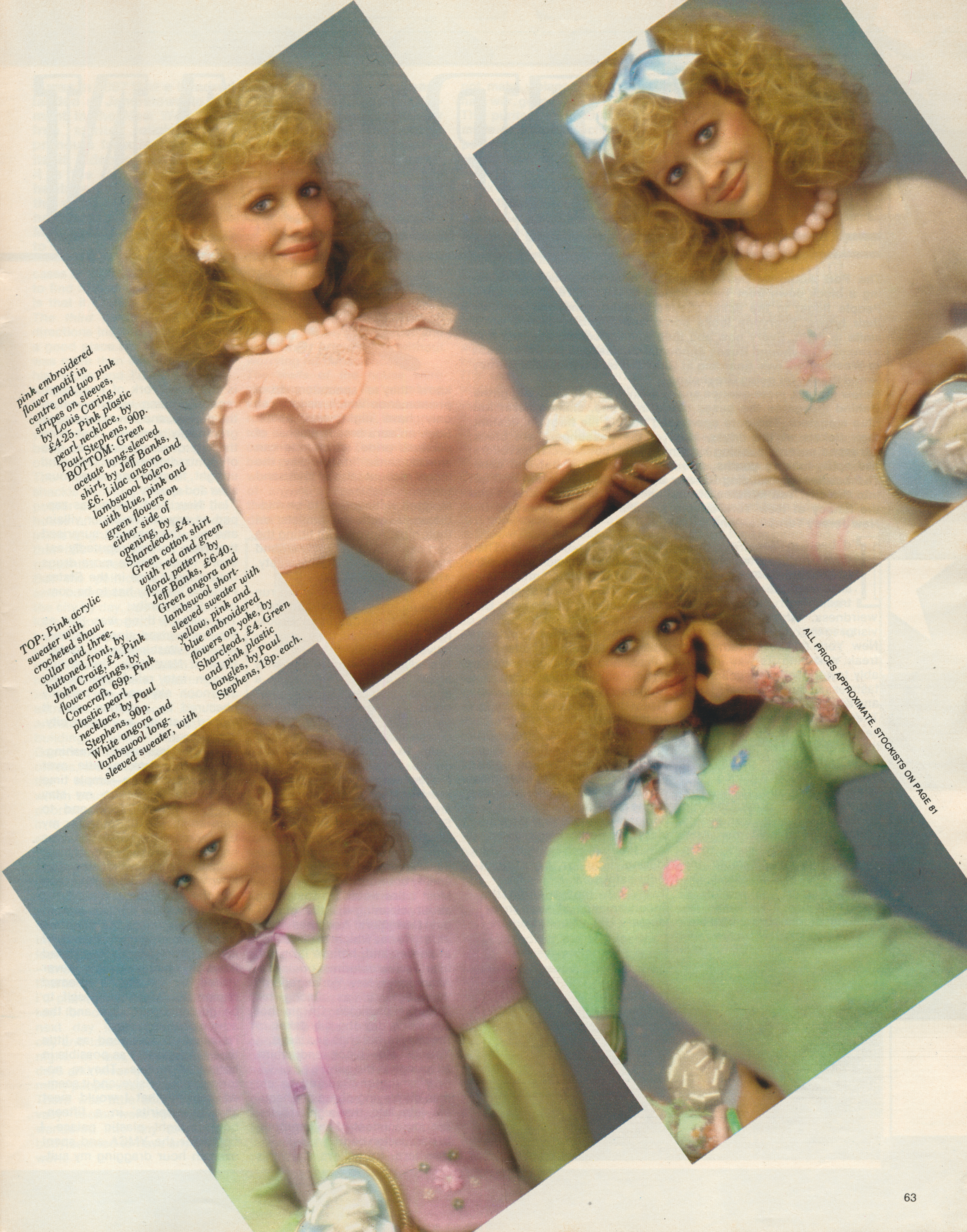 TOP: Pink acrylic sweater with crocheted shawl collar and three-buttoned front, by John Craig, £4. Pink flower earrings, by Corocraft, 69p. Pink plastic pearl necklace, by Paul Stephens, 90p. White angora and lambswool long-sleeved sweater, with pink embroidered flower motif in centre and two pink stripes on sleeves, by Louis Caring, £4-25. Pink plastic pearl necklace, by Paul Stephens, 90p. BOTTOM: Green acetate long-sleeved shirt, by Jeff Banks, £6. Lilac angora and lambswool bolero, with blue, pink and green flowers on either side of opening, by Sharcleod, Green cotton shirt with red and green floral pattern, by Jeff Banks, .£6.40. Green angora and lambswool short-sleeved sweater with yellow, pink and blue embroidered flowers on yoke, by Sharcleod, £4. Green and pink plastic bangles, by Paul Stephens, 18p. each.