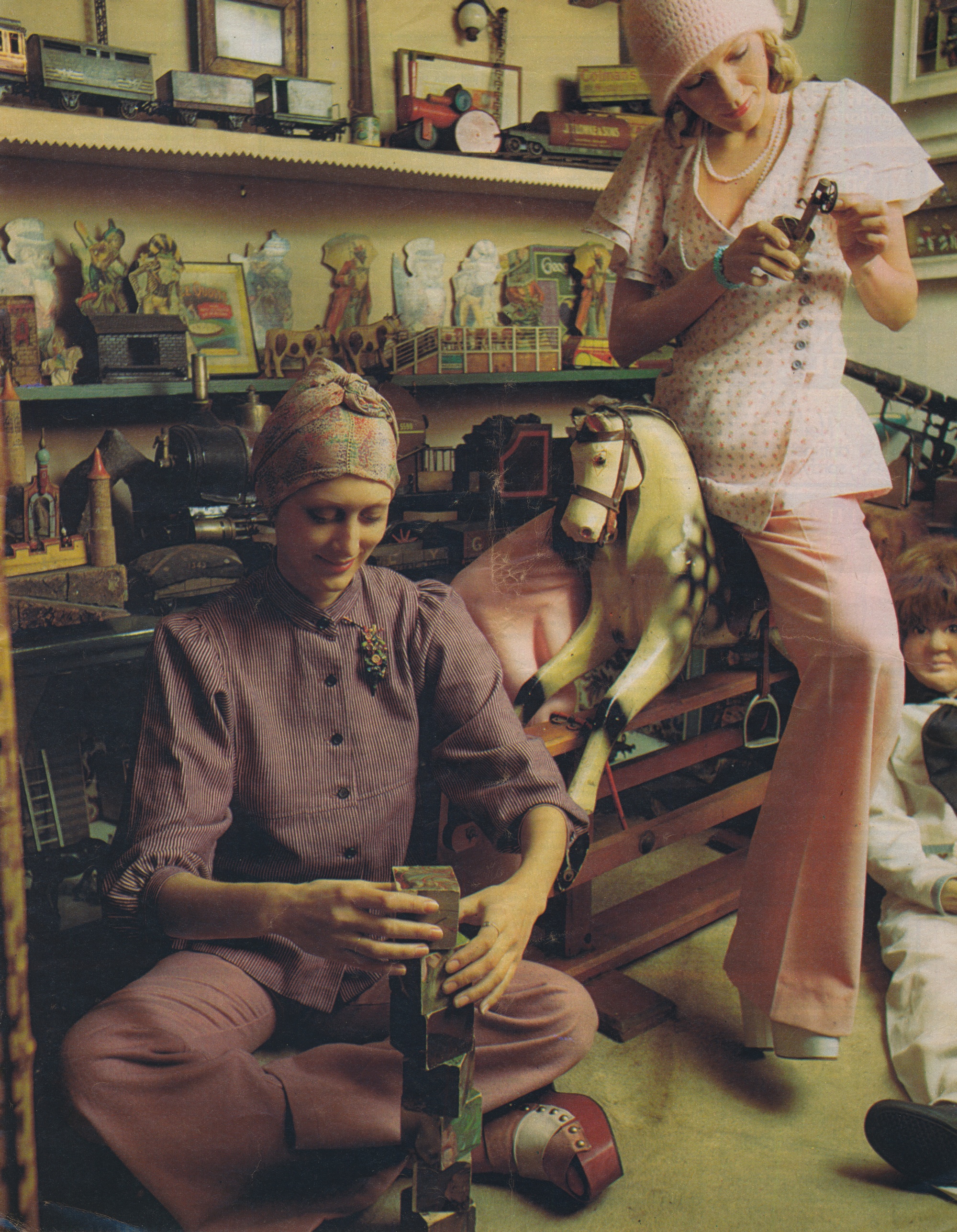 Winceyette teddy print smock and matching skirt, Travers Tempos, £4.50 each at Sidney Smith SW3. Necklace from Britannia Land of Plenty SW3. Hair combs, Tailpieces 25p. Mary Quant shoes. Teddy pants and panelled top, Travers Tempos £8.50 at Sidney Smith SW3. Felt bowler Edward Mann £2.80. Swan brooch Britannia Land of Plenty.