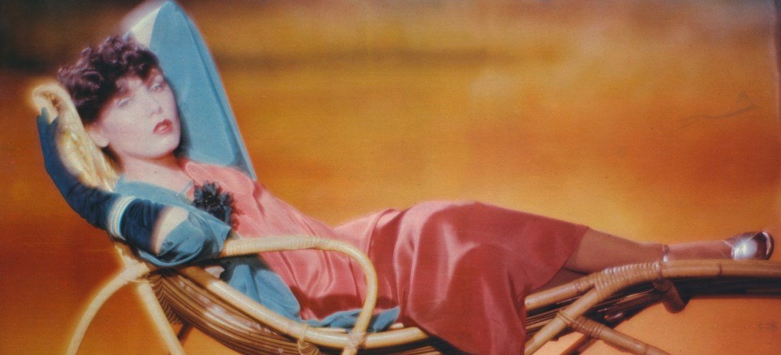 Glamorous funnel-shaped crepe-de-chine sleeveless mid-calf length dress and loose jacket with dipped hem, side pockets and matching triangular scarf (not shown), Monet £21, from Che Guevara, Kensington High Street, W8. Elbow-length evening gloves, D H Evans £2.40; fabric rose, D H Evans £2.20; silk bangles, Gay Designs £2; leather peep-toe shoes, Russell & Bromley £24.99. Cane chaise longue, Biba £52.50.