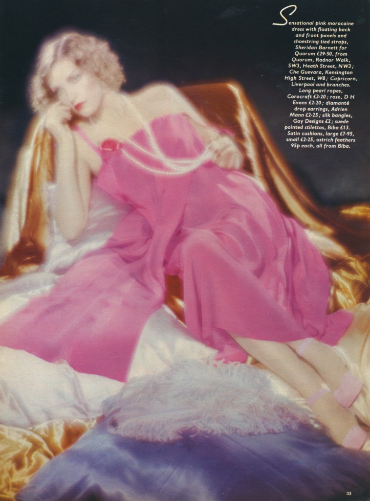 Sensational pink morocaine dress with floating back and front panels and shoestring tied straps, Sheridan Barnett for Quorum £29.50, from Quorum, Radnor Walk, SW3. Long pearl ropes, Corocraft £3.20; rose, D H Evans £2.20; diamante drop earrings, Adrien Mann £2.25; silk bangles, Gay Designs £2; suede pointed stilettos, Biba £13. Satin cushions, large £7.95, small £2.25, ostrich feathers 95p each, all from Biba.