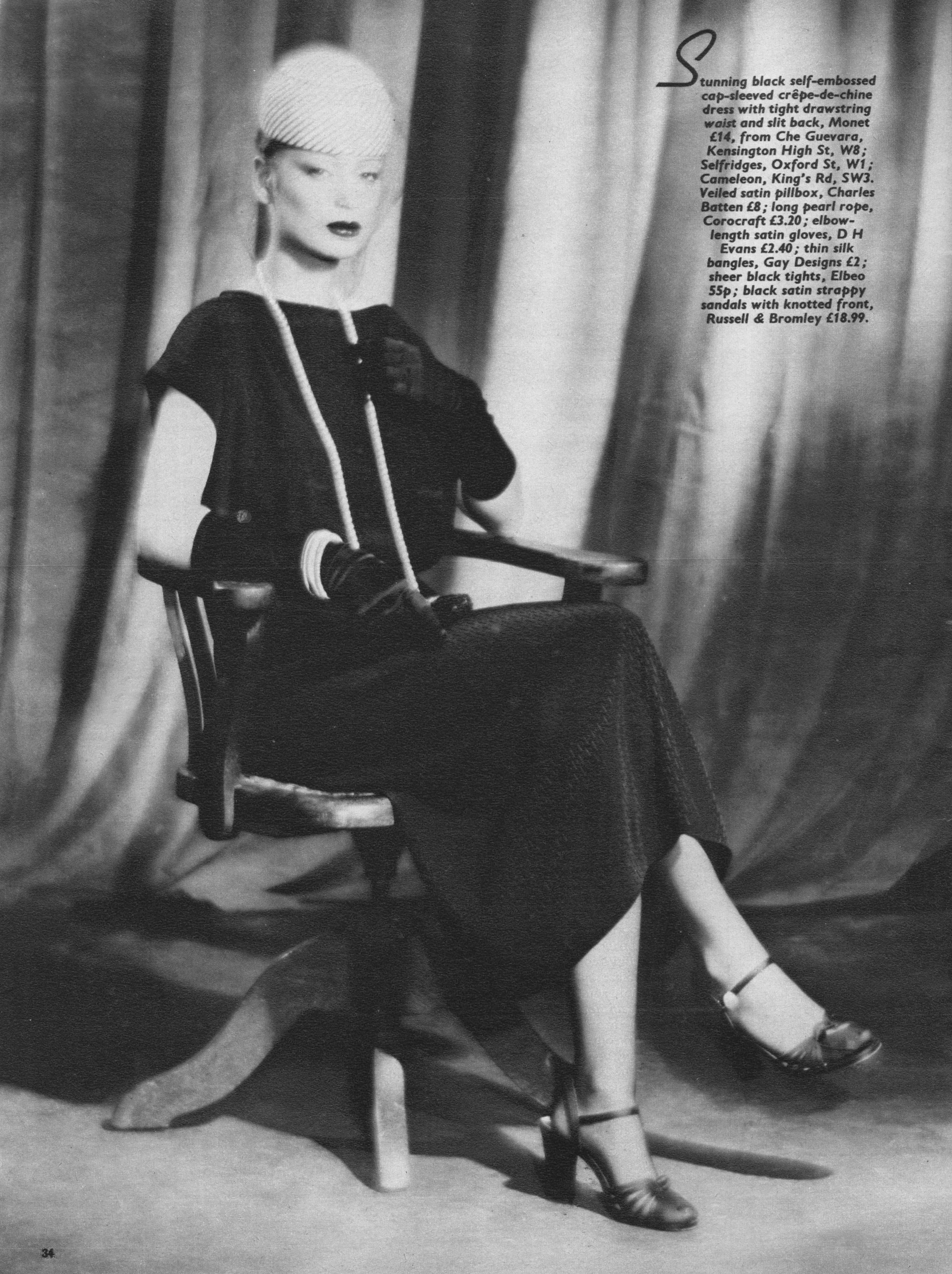 Stunning black self-embossed cap-sleeved crepe-de-chine dress with tight drawstring waist and slit back, Monet £14, from Che Guevara, Kensington High St, W8. Veiled satin pillbox, Charles Batten £8; long pearl rope, Corocraft £3.20; elbow-length satin gloves, D H Evans £2.40; thin silk bangles, Gay Designs £2; sheer black tights, Elbeo 55p; black satin strappy sandals with knotted front, Russell & Bromley £18.99.