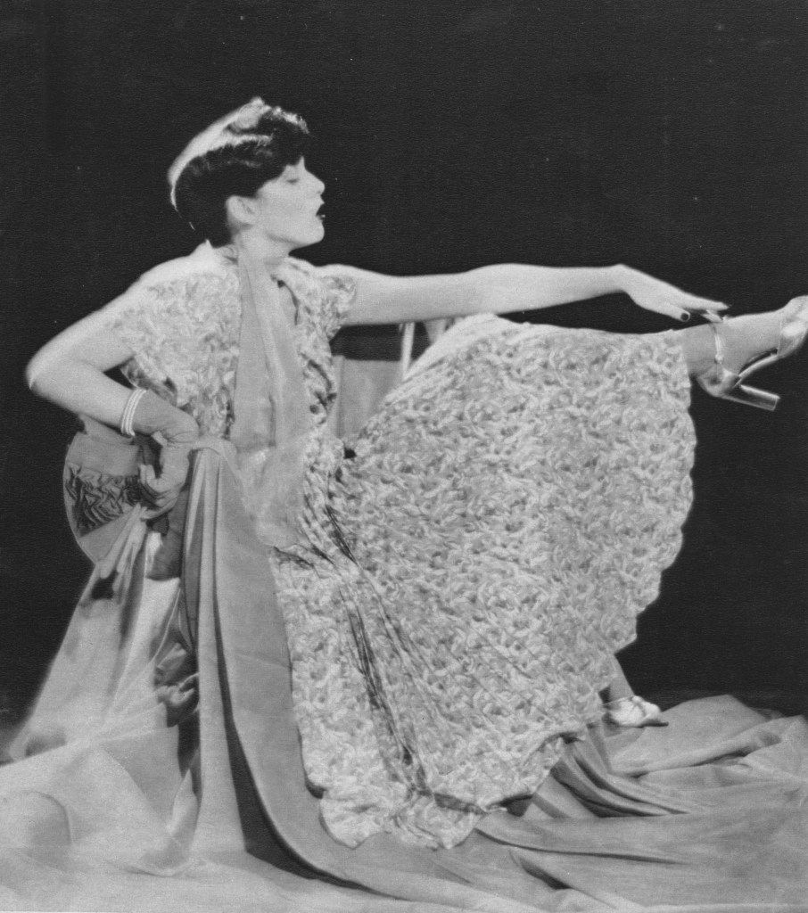 Clinging jet black strapless frilled pencil-slim knee-length dress with spotted net drapes and pink tulle rose trim, from a selection starting at £5 at Martha’s Market, Martha Hill, 39 Marylebone High St, Wl. Sparkling sequined pillbox hat, Charles Batten £9.95; black flowered lace, Martin Klein 65p a yard;.long black evening gloves, D H Evans £2.40; mother-of-pearl and gilt compact £8.50, and sequin evening bag £2.05, both from Biba ; carved jet drop earrings, Adrien Mann £2.25.