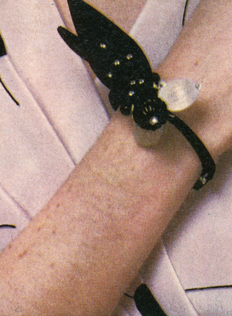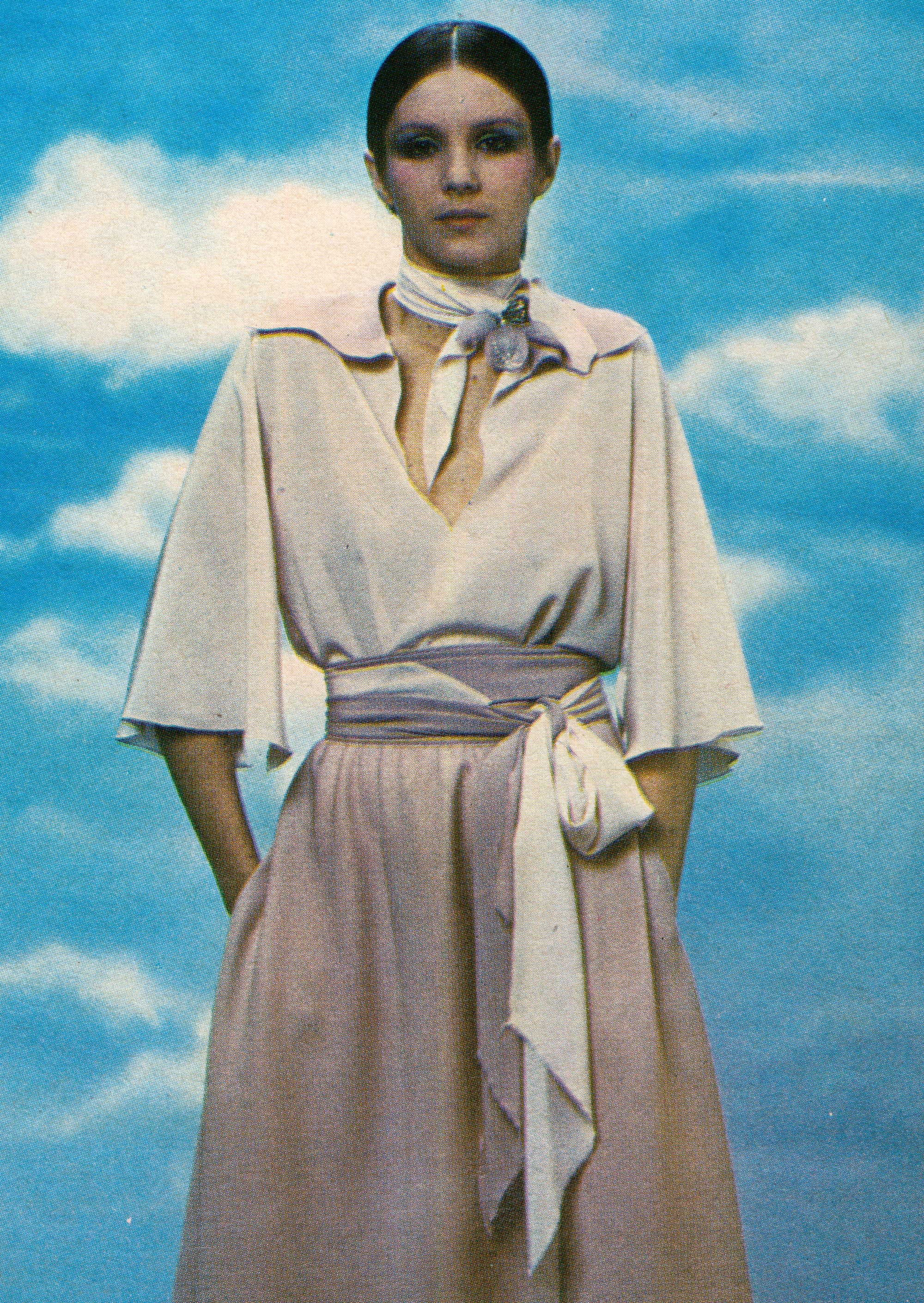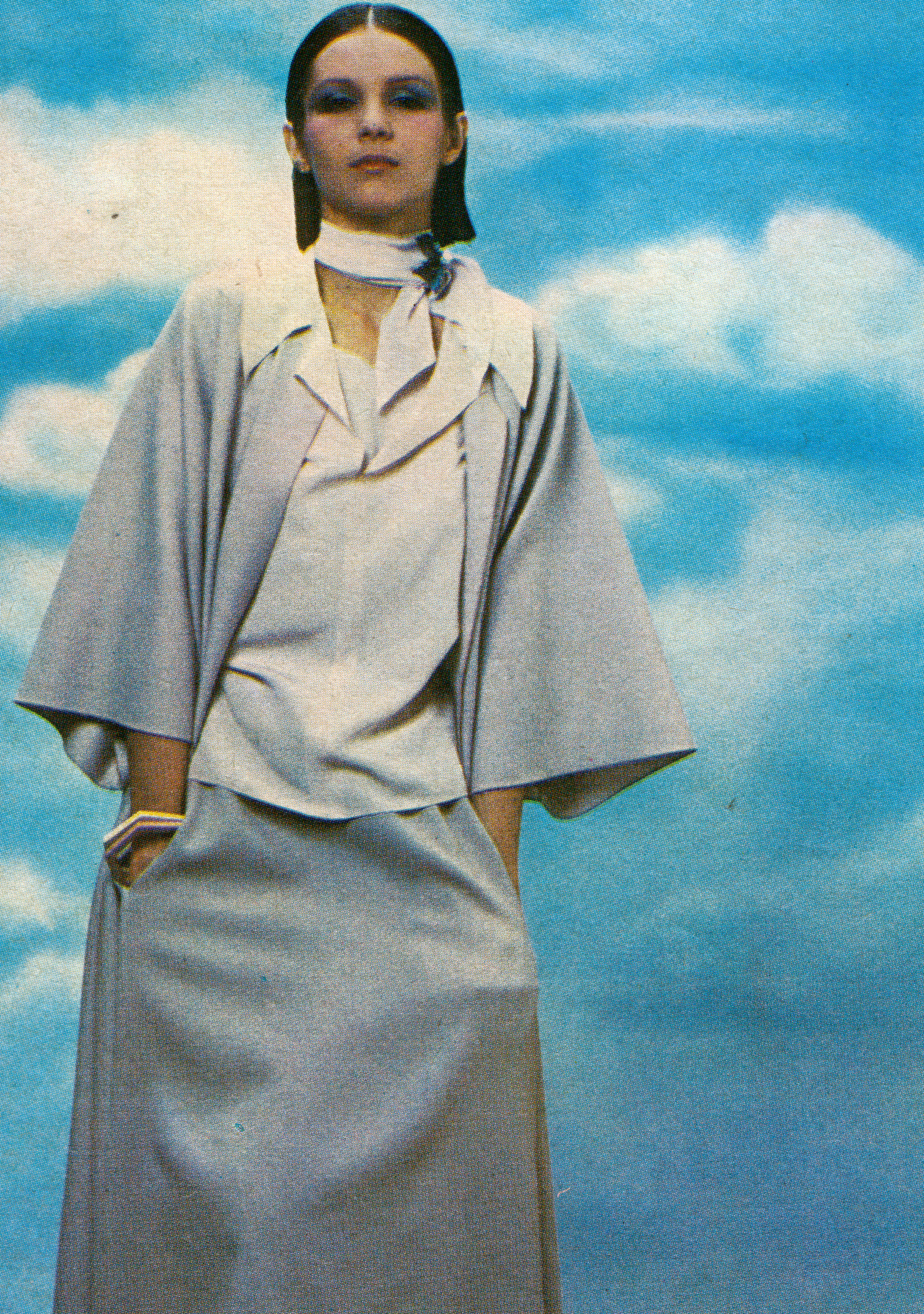 We’ve tried to capture the golden richness and mellow nuances of a well-preserved old oil painting, and create our October face with the new Moody Hues make-up from Revlon’s Natural Wonder collection. Face tone should be warm and tinged with a hint of tan, and we used foundation colour ‘Bisque Beige’, 66p., dusted over very lightly with translucent pressed powder in the ‘Medium’ shade, £1.02. We rouged the cheeks with Cheek Shine in ‘Red’, £1-32. Pursuing the same rustic-toned theme we chose ‘Soulful Plum’ mascara and lashed it on both top and bottom lids, 85p. Eyes are a muted melange of ‘Tortoiseshell’ Eyeshadow Stick, 66p., and the same shade in Lid Lights, the powder version, fading to complementary ‘Minty Green’ powder shadow just under the brows, £1.10 each. We dabbed over the eyelids with ‘Brown Shine’ cream blusher for extra gloss and softness, £1.32. Lips are outlined in ‘Bracken Brown’, 62p.