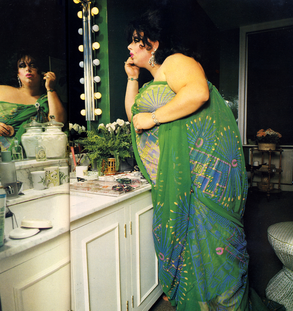 Divine at his toilet, using On-Stage make-up available from Nina Campbell. His toga is Zandra Rhodes printed silk, ‘Mexican Turnabout’. Bracelets and brooch by The Purple Shop, 15 Flood Street. Rings and drop earrings by Adrien Mann, small diamond earrings by Ken Lane, brooches on washbasin from Andrew Logan’s Galactic collection. Make-up by Richard Sharah, wigs by Wig Creations.