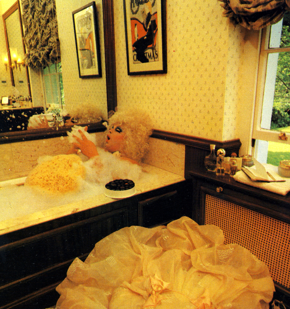 Divine bathing in Jean Harlow mood. Abandoned ball dress by Zandra Rhodes. Shell ring by Andrew Logan, £40 from 15 Appold Street, EC2. Chocolates by Charbonnel et Walker.