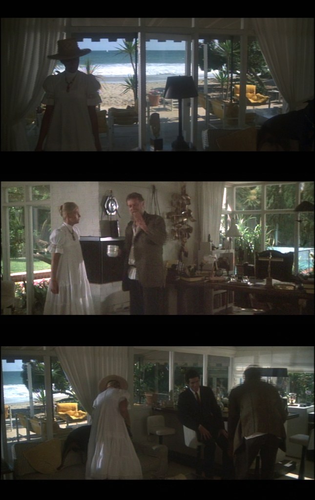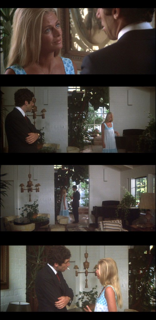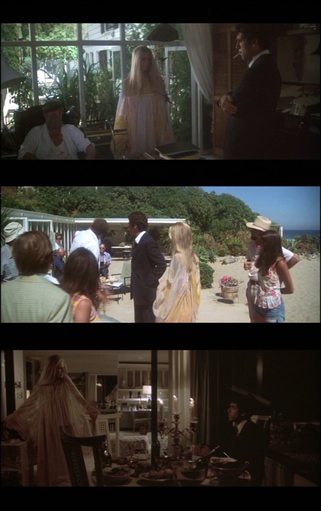 By this point, I started wondering if this wardrobe was perhaps that of the actress rather than of the character. Nina van Pallandt was a successful Danish singer (with husband Frederik van Pallandt, they were known as ‘Nina and Frederik’) and would have spent a great deal of time in London. It otherwise seemed a bit odd that she was wearing clearly British-made clothes, albeit in a style which wouldn’t seem too dramatically out of place in early 1970s California. It certainly sets her apart from the few other women in the film, including Marlowe’s doped up neighbours (who are rarely clothed at all), and gives her a dreamy, other-worldly quality.