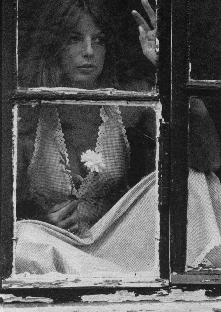 It looks as if England has lost Jane Birkin forever … she is firmly entrenched in Paris with baby Kate, nanny and the lovely Serge Gainsbourg, living in sombre luxury in their newly acquired house. The interior is stark and dramatic, every room is decorated in black and white, with white doors and black marble floors or carpet. The furniture is also black and white—there’s a big black shiny piano in the lounge, and a black mink cover adorns the bed which is raised off the floor on a black perspex dais. Weekends are usually spent at a quiet retreat in the country, making a sharp contrast to the busy social life that they lead during the week. Since Jane landed in France she has never stopped working. Film after film has been completed and the success of the record she made with Serge, which was also written and composed by him, Je T’Aime … Moi Non Plus, has led to an LP also written by Serge. Her life is chaotic and busy, it seems as if the telephone never stops ringing. People phone her every day with offers of interviews and films, the next of which is still a closely guarded secret. It was whilst she was making her first film in France, Slogan, that she met and fell in lovewith Serge, an event which seems to have altered her life but through it all she remains the same—a waif of a girl, tall and lanky, in pullover and jeans, serving tea out of her treasured English teapot. Her wardrobe is noticeably small, consisting mainly of casual clothes like pullovers, T-shirts and jeans; with the occasional gipsy-type dress reserved for the evening and worn with gold chains, loop earrings and gipsy belts. She acquires most of her clothes by chance buying, rarely by intentionally setting out on a spending spree. Usually she just spots something she likes in a shop window and ends up by going in and buying it. In London she shops mainly at Countdown, Foale and Tuffin, and Quorum. She buys her jewellery from the Chelsea Antique Market. In Paris she favours the more trendy designers like Mia and Vicky or Jean Bourquin. Jane is perfectly happy spending hours hunting about in antique shops for interesting little knick-knacks, like the 18th-century doll’s house which she gave to her Serge for Christmas.