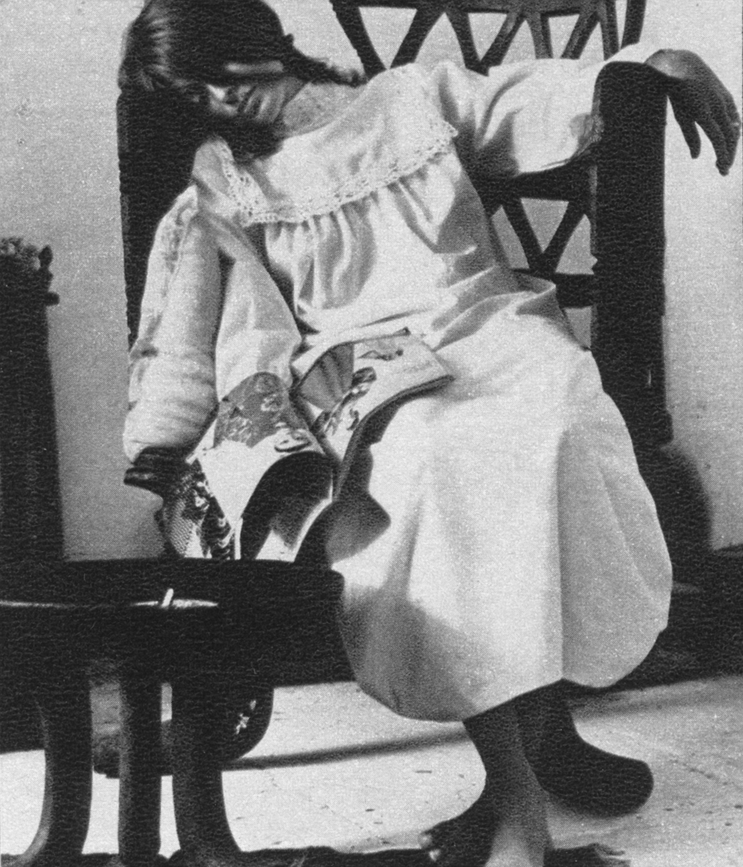Nursery print cotton pinafore dress by Gillian Richard. Cotton satin petticoat at Laura Ashley. Lace up boots at Anello and Davide.