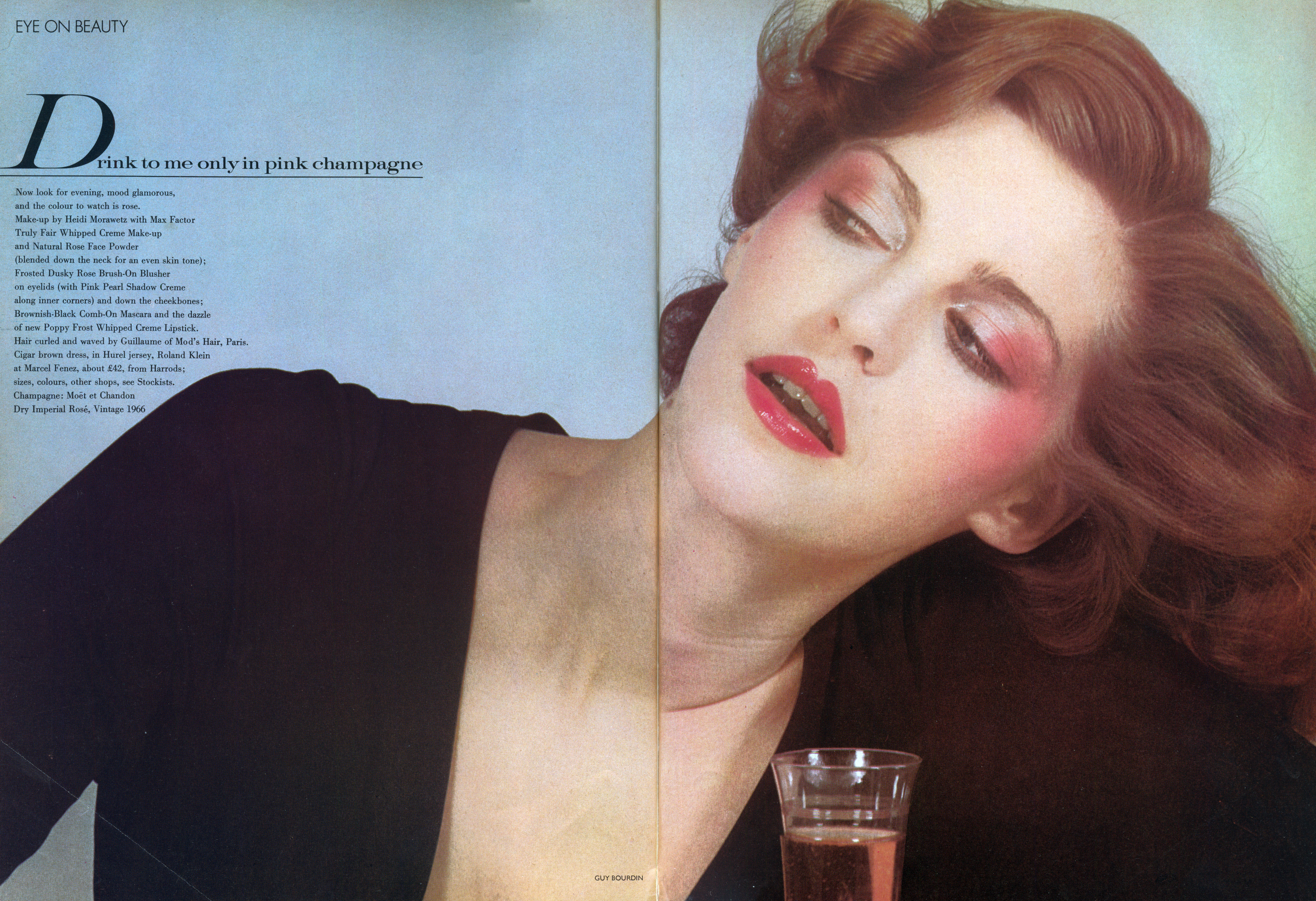 Now look for evening, mood glamorous, and the colour to watch is rose. Make-up by Heidi Morawetz with Max Factor Truly Fair Whipped Creme Make-up and Natural Rose Face Powder (blended down the neck for an even skin tone); Frosted Dusky Rose Brush-On Blusher on eyelids (with Pink Pearl Shadow Creme along inner corners) and down the cheekbones; Brownish-Black Comb-On Mascara and the dazzle of new Poppy Frost Whipped Creme Lipstick. Hair curled and waved by Guillaume of Mod’s Hair, Paris. Cigar brown dress, in Hurel jersey, Roland Klein at Marcel Fenez, about £42, from Harrods; sizes, colours, other shops, see Stockists. Champagne: Moet et Chandon Dry Imperial Rose, Vintage 1966.