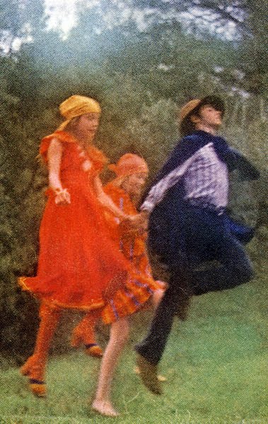 The boy’s stripey sweater and white Oxford bags are from Tramps. Price is £7.50 from Gary Elliott; Edwardia of Manchester; Paul Smith, Nottingham. the sweater cost £4 and also comes from Paul Smith, as well as the George Best shops, and Quincy of the Kings Road. The girl’s outfit is from a selection by Miss Mouse at Peter Robinson.